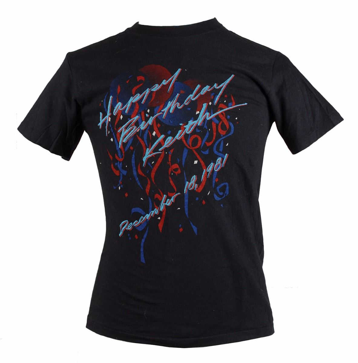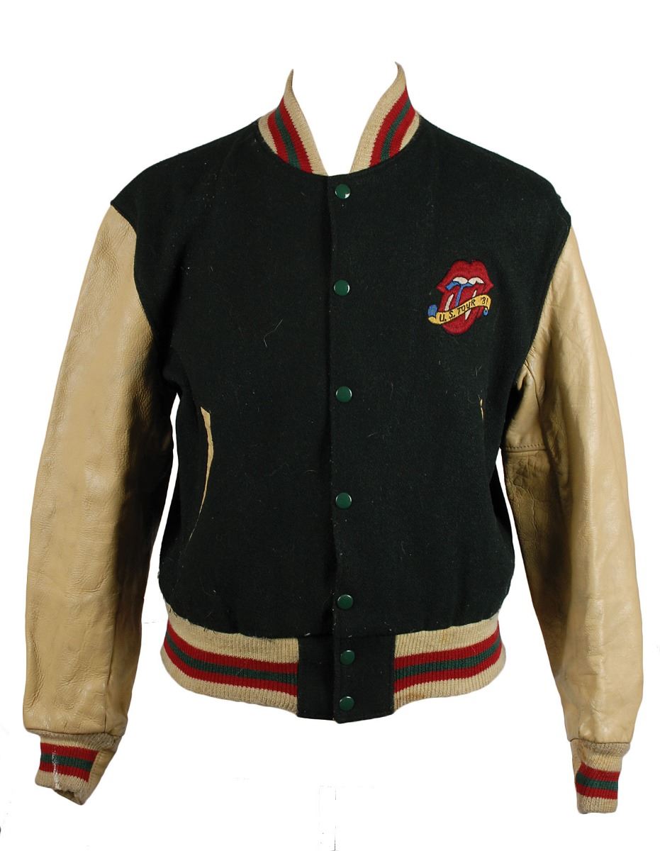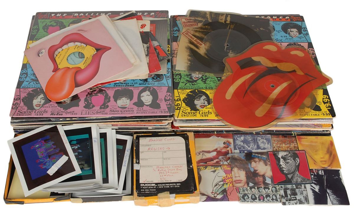 Impressive archive of approximately 100 items, consisting primarily of various albums and singles, with additional uncommon production material related to the Rolling Stones period of 1981–1984, originating from the personal collection of Marlene Cohen, a former photo editor at Rolling Stone magazine and the girlfriend of Art Collins, the president of Rolling Stones Records. Highlights include: Keith Richards’s poplin-style turquoise scarf with cigarette burns, approximately 68 x 11.25, gifted to Cohen at the offices of Rolling Stones Records in Rockefeller Plaza; a pair of vintage circa 1981 black short sleeve t-shirts, both size medium, one showing a patriotic mouth logo on the front with the back reading, “Tattoo You, Rockford, Ill., October 1, 1981, WZOK,” and the other reading “Happy Birthday Keith, October 18, 1981” against a balloon and confetti background; a green and beige touring varsity jacket with wool body and leather sleeves, no size but likely medium, with an embroidered Rolling Stones mouth logo patch, “U. S. Tour ’81,” stitched to the chest; a program for the Rolling Stones’ 1981 American tour; a massive color 40 x 52 poster of the image used for the 1976 Frampton Comes Alive! album; a color 24 x 30 anniversary poster showing various album covers released during the band’s first twenty years; a set of ten bubblegum Rolling Stones miniature albums; two boxes of original photographs from the photo shoot for the front cover of the Rolling Stones’ 1984 compilation album Rewind, consisting of thirty-nine Polaroid photos and sixteen transparency photos, each housed in original Duggal boxes listing Cohen as the client, with delivery instructions, “c/o Rolling Stone Mag. 745 5th Avenue, 23rd floor, NYC”; a set of twelve original color negatives from the Rewind photo shoot, border of each image bearing a photo credit stamp, “’84 Ken Regan Camera”; and a set of three preliminary record cover artwork proofs for the albums Rewind, Released, and Five and Tens(e), the latter two titles were apparently related to unresolved projects.