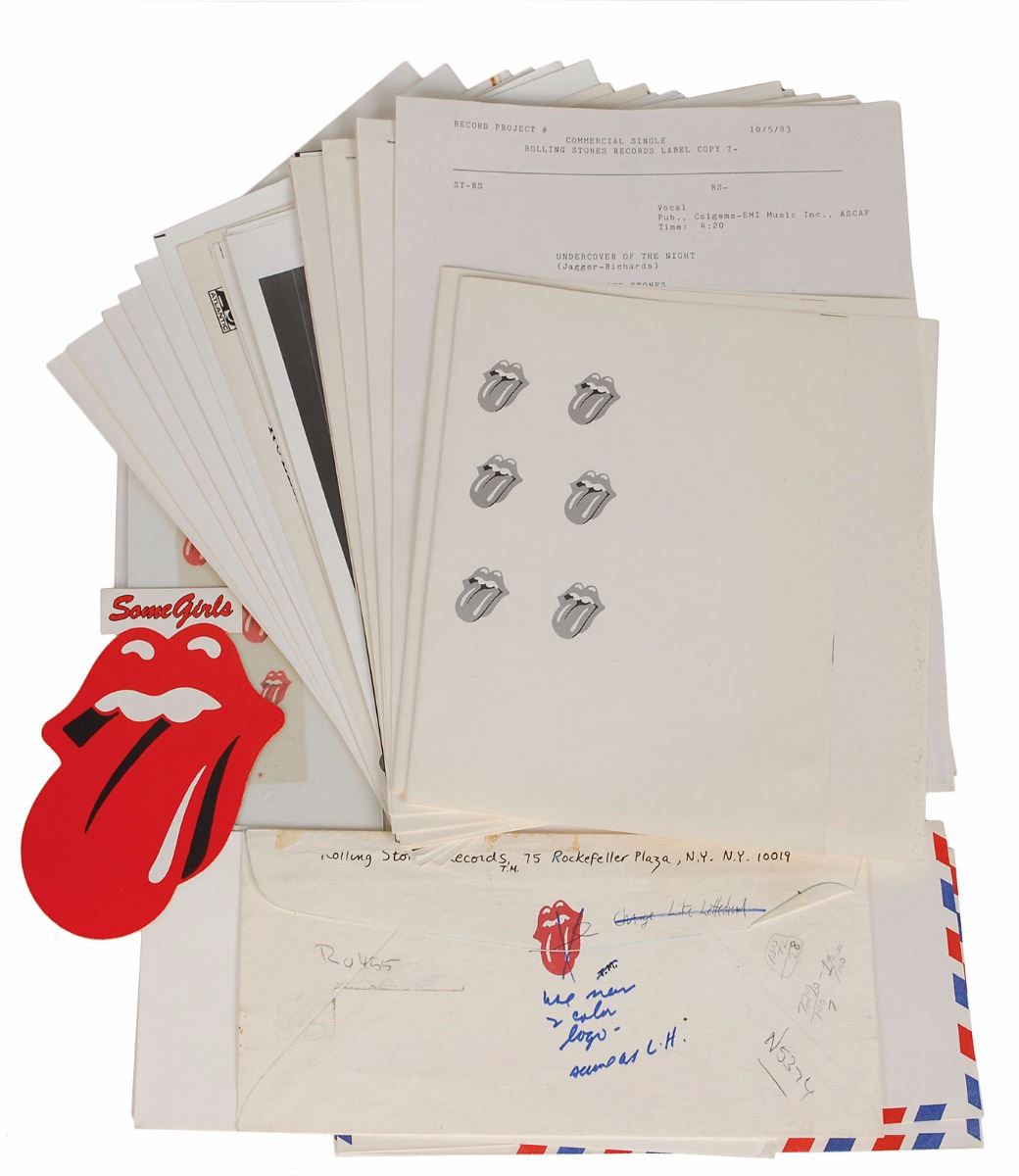Rolling Stones Records material related to the promotion and production of the Rewind and Undercover albums, including: a set of fifteen unsigned publicity photos, the majority 8 x 10 and 10 x 8, depicting the band as well as individual members, with a focus on Mick Jagger; info sheets for the commercial single ‘Undercover of the Night / All the Way Down’ and the label copy single ‘Undercover of the Night,’ both dated October 5, 1983; typescript lyric sheets for the songs ‘Too Tough,’ ‘Undercover (Of the Night),’ ‘She Was Hot,’ ‘Tie You Up (The Pain of Love),’ ‘Wanna Hold You,’ ‘Feel on Baby,’ ‘Too Much Blood,’ and ‘Pretty Beat Up’; sketches and handwritten notes by Cohen concerning layout for the Rewind album cover; and a host of ephemera such as mailing envelopes, stickers, a promo card, the majority of which bearing the band’s famous mouth logo, and a letter signed by Rolling Stones Records President Art Collins.