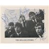 Excellent vintage Decca Records promo card of the Rolling Stones, 5.5 x 4.25, crisply signed in blue ballpoint by Mick Jagger, Brian Jones, Keith Richards, Bill Wyman, and Charlie Watts, who adds “xxx.” Text on the reverse of the card promotes their recent singles, ‘Come On/I Wanna Be Loved’ and ‘I Wanna Be Your Man/Stoned.’ In unusually fine, clean condition. This features the same image used for the cover of the band’s self-titled debut EP, which Decca released in January 1964 to test the commercial appeal of the Rolling Stones before they would commit to producing a full album. This promo card is in far better condition than those typically seen—a superlative, fully signed example.