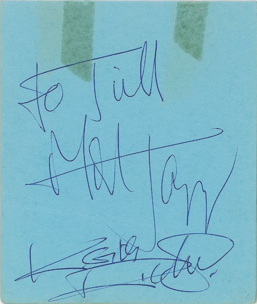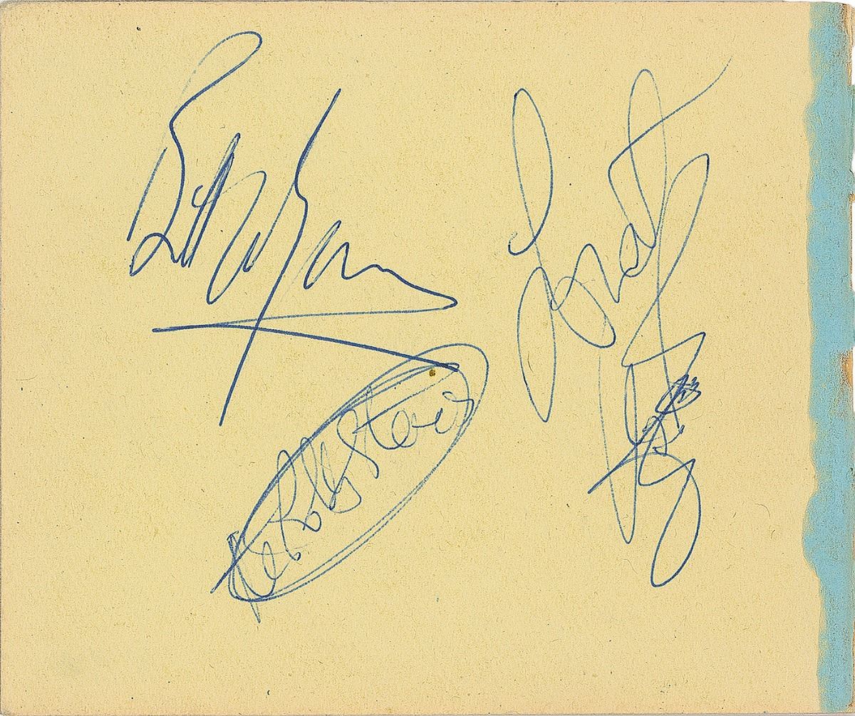 Full set of vintage Rolling Stones signatures on three album pages, including: a blue 3.75 x 4.5 album page signed and inscribed in blue ballpoint, “To Jill, Mick Jagger” and “Keith Richards”; a green 4.5 x 3.75 album page signed in blue ballpoint, “Brian Jones”; and a yellow 4.5 x 3.75 album page signed in blue ballpoint, “Bill Wyman” and “Love, Charlie Boy, The Rolling Stones.” In overall fine condition, with old tape stains to the Jagger and Jones pages. Accompanied by a letter of provenance from the original recipient, in part: “The year was 1968 in Swarkestone, Derbyshire…I was stuck inside on a sunny, summer’s day revising for my O’ levels when the phone rang, it was our neighbor…from Swarkestone Old Hall Farm asking me and my brother to come and meet the Stones (I thought he was joking). Sure enough, they were all there for a photo shoot for their ‘Beggars’ Banquet’ LP. We walked down to the banks of the River Trent and it was here I was lucky enough to get all of their autographs.”