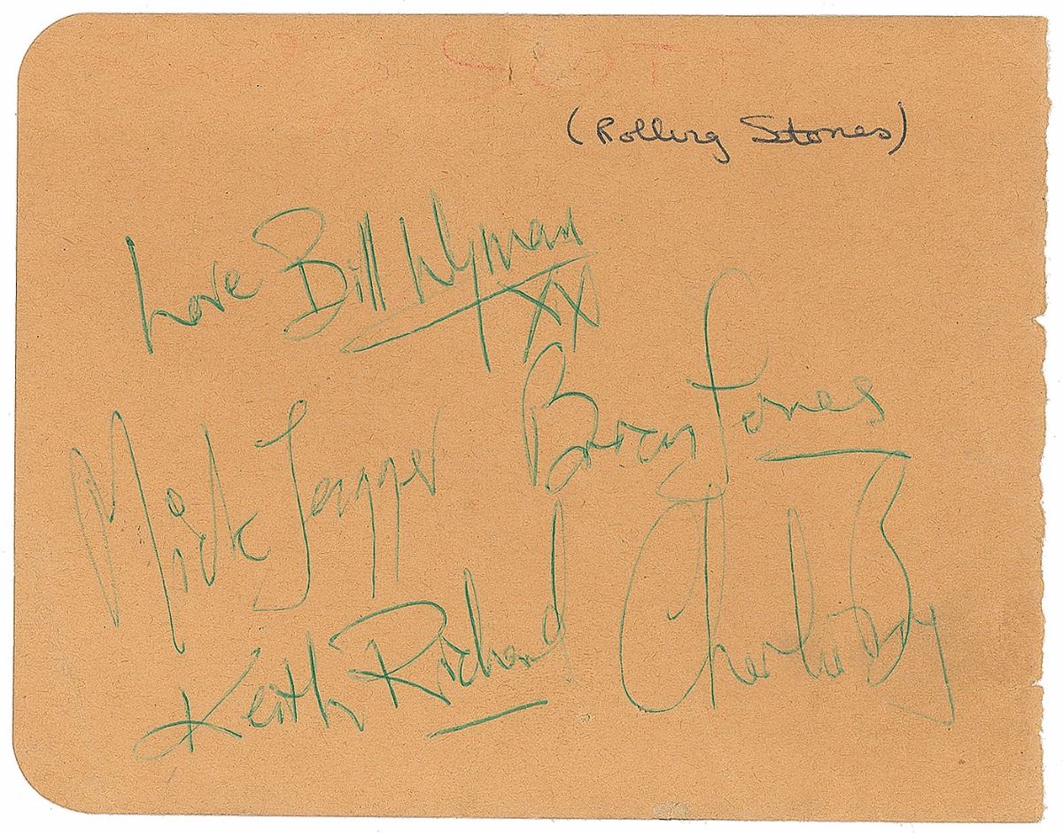 Appealing green ballpoint signatures, "Love Bill Wyman, xx," "Mick Jagger," "Brian Jones," "Keith Richards," and "Charlie Boy," on an off-white 5.25 x 4.25 album page. In fine condition. Consignor notes that the signatures were obtained at Kettering's Granada Cinema on January 9, 1964. Accompanied by a letter of provenance from the original recipient.