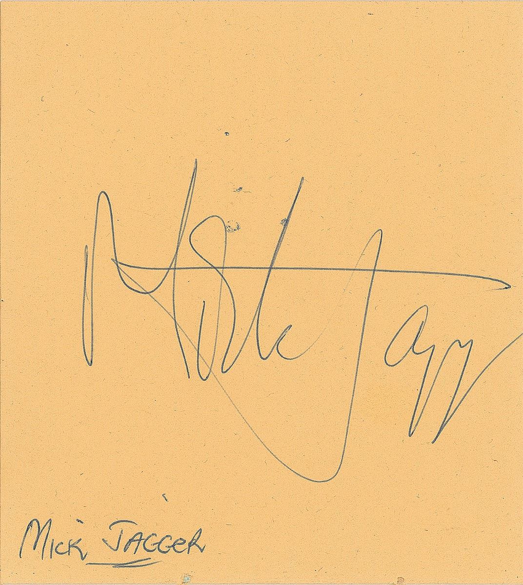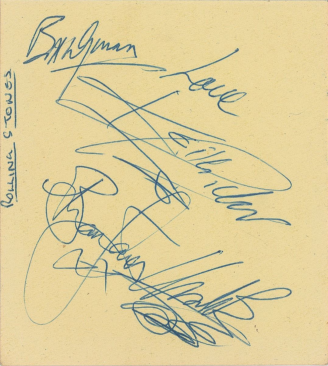 Circa 1964 blue ballpoint signatures, "Bill Wyman," "Love, Keith Richards, xx," "Brian Jones, xx," and "Charlie Boy, xx," on a yellow 4.25 x 3.75 autograph page, and a black ballpoint signature, "Mick Jagger," on an orange 3.75 x 4.25 autograph page. In overall fine condition. Accompanied by a copy of a letter of provenance and an unsigned vintage promo card. Consignor notes that the signatures on the multi-signed page were obtained backstage at the Locarno Ballroom on April 1, 1964.