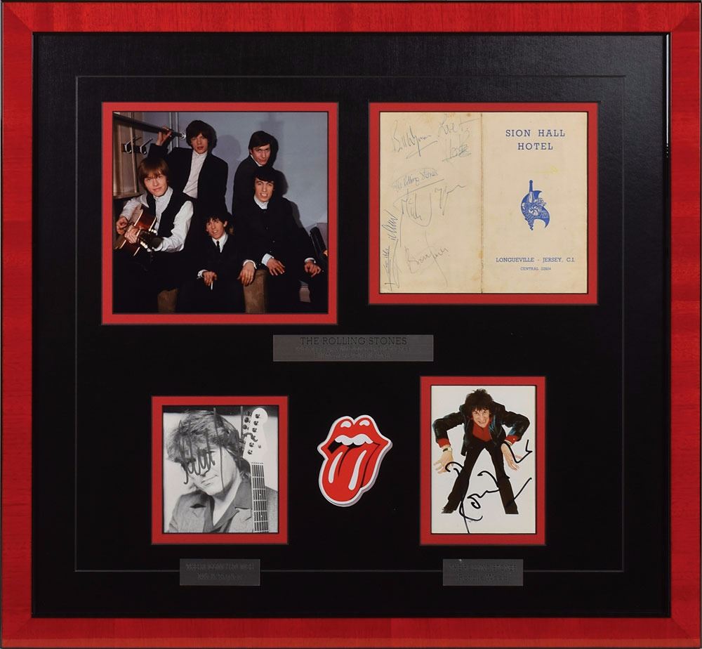 Impressive display featuring three signed items: a vintage circa 1964 menu from the Sion Hall Hotel in Longueville, Jersey, measuring 7.75 x 6.75 open, signed on the back cover in ballpoint by the original lineup of Mick Jagger, Brian Jones, Keith Richard, Charlie Watts, and Bill Wyman; a cardstock 4.25 x 4.75 photo of guitarist Mick Taylor, signed in silver ink; and a color 4 x 5.5 cardstock photo of guitarist Ronnie Wood, signed in black felt tip. Impressively double-matted and framed together with an additional group photo and engraved nameplates to an overall size of 26 x 24. In overall very good to fine condition, with scattered creasing and soiling to the signed menu. Accompanied by a certificate of authenticity from Tracks for the signed menu, and full letters of authenticity from REAL for all three signed items. Also includes a letter of provenance for the signed menu, stating that the autographs were signed during their stay at the Sion Hall Hotel for their shows in Jersey on August 21–22, 1964. A wonderful assemblage representing the most prolific Stones lineups.