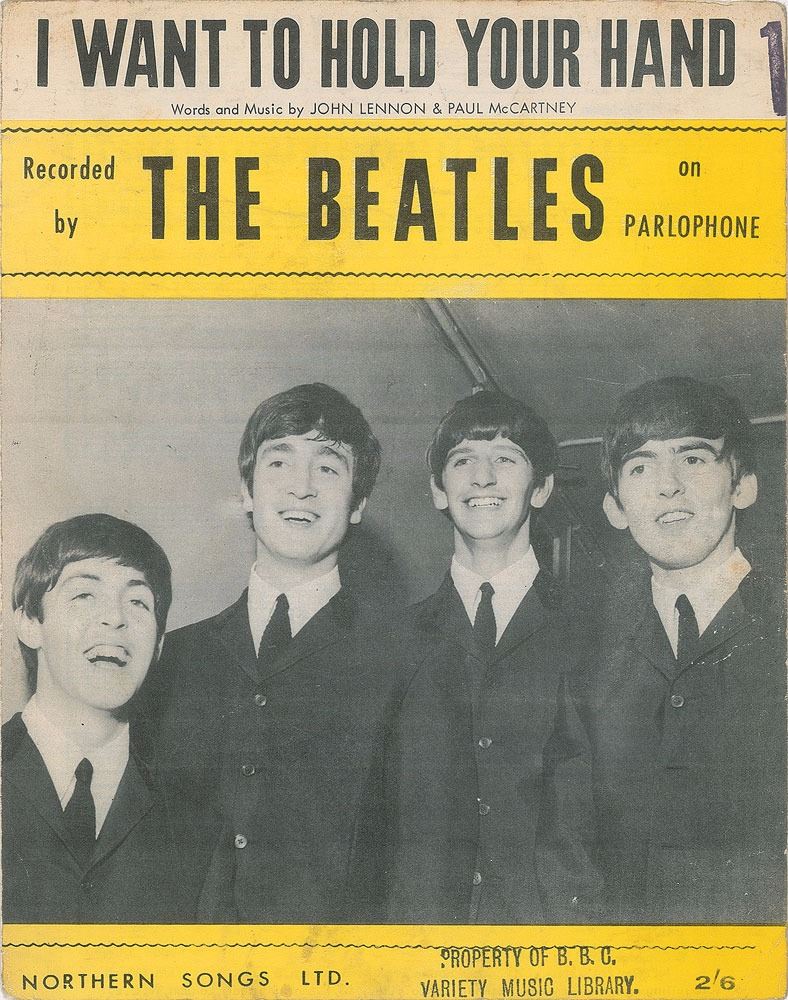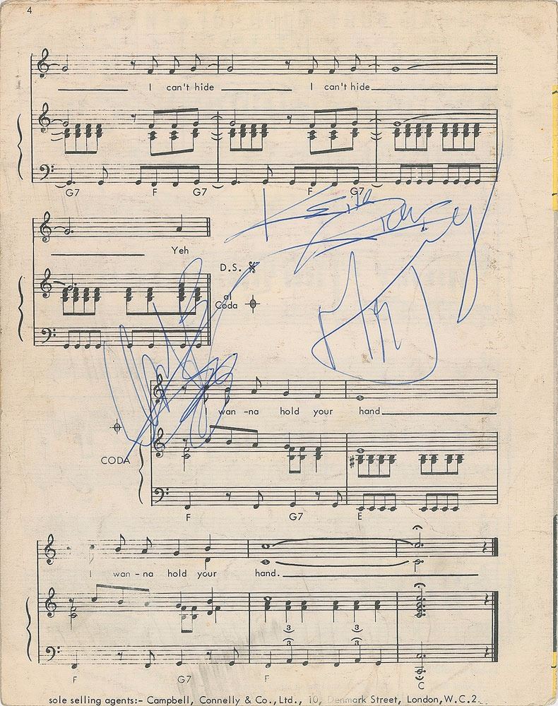 Vintage circa 1964 sheet music booklet for The Beatles song 'I Want to Hold Your Hand,' published by Northern Songs Ltd., three pages, 8.5 x 10.75, signed on the back page in blue ballpoint, "Keith Richard," "Mick Jagger," and "Charlie Boy." In fine condition, with light soiling and handling wear.