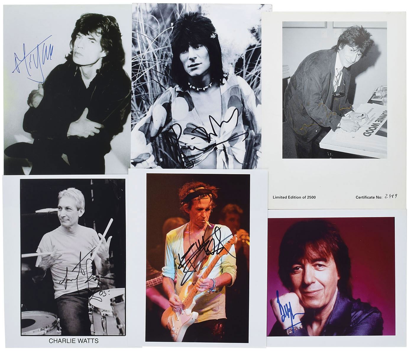 Group of six photos signed by a member of the Rolling Stones, including: a glossy 8.25 x 11.75 photo of Mick Jagger seated with his arms crossed, signed in blue felt tip; a color glossy 8 x 10.25 photo of Keith Richards smoking a cigarette and playing the guitar, signed in black felt tip; a color glossy 10.5 x 8 close-up photo of Bill Wyman, signed in blue felt tip; a semi-glossy 8 x 10 photo of Charlie Watts seated and twirling his drum sticks, signed in black felt tip; a limited edition semi-glossy 8.25 x 11.25 paperstock photo of Ronnie Wood signing posters, numbered 2489/2500, signed in gold ink; and a glossy 8 x 12 photo of Wood early in his career with his arms akimbo, signed in black felt tip. In overall very good to fine condition, with a light bend, and some discoloration, to the left edge of the Jagger photo.