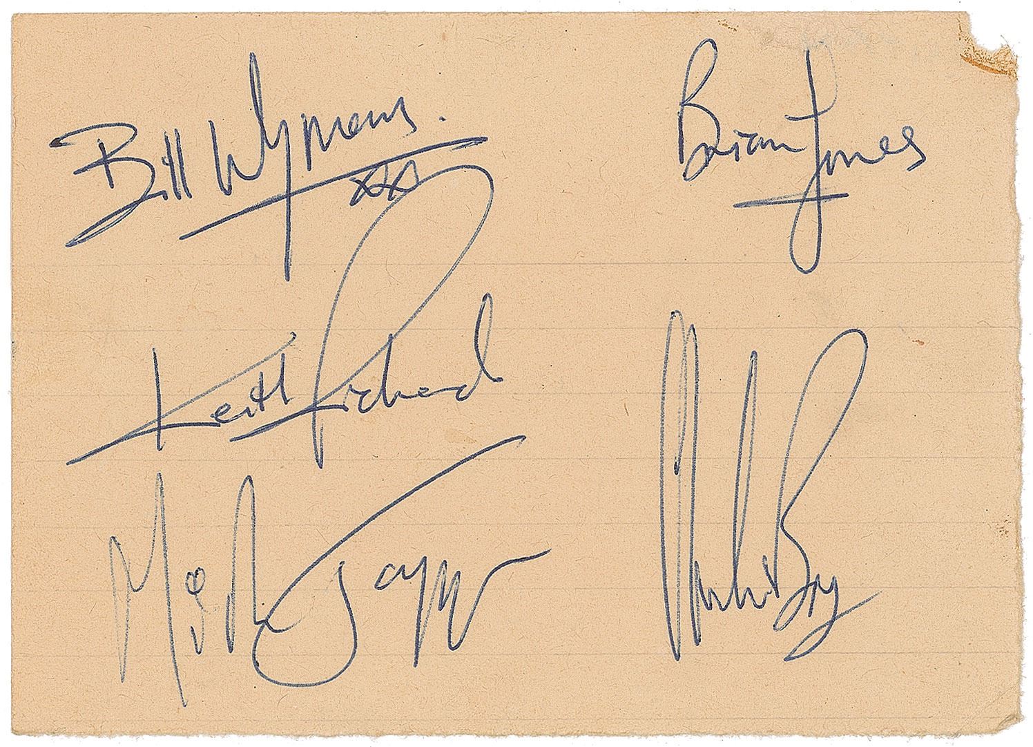 Circa 1964 vintage ballpoint signatures, "Bill Wyman, xx," "Brian Jones," "Keith Richard," "Mick Jagger," and "Charlie Boy," on an off-white 5 x 3.4 album page. In fine condition, with paper loss to the upper right corner tip. Accompanied by a certificate of authenticity from Tracks.