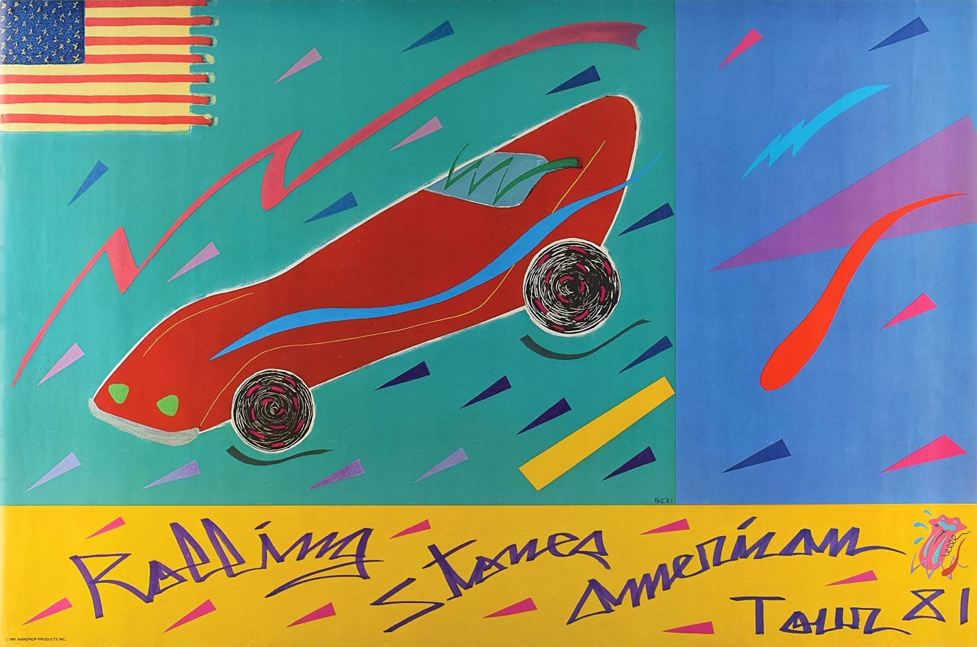 Colorful original 33 x 22 official tour poster for the Rolling Stones' 1981 American Tour, showing an American flag with red sports car design by Japanese artist Kazuhide Yamazaki. Yamazaki also designed the touring stage set used by the band. In fine condition, with scattered light creasing.