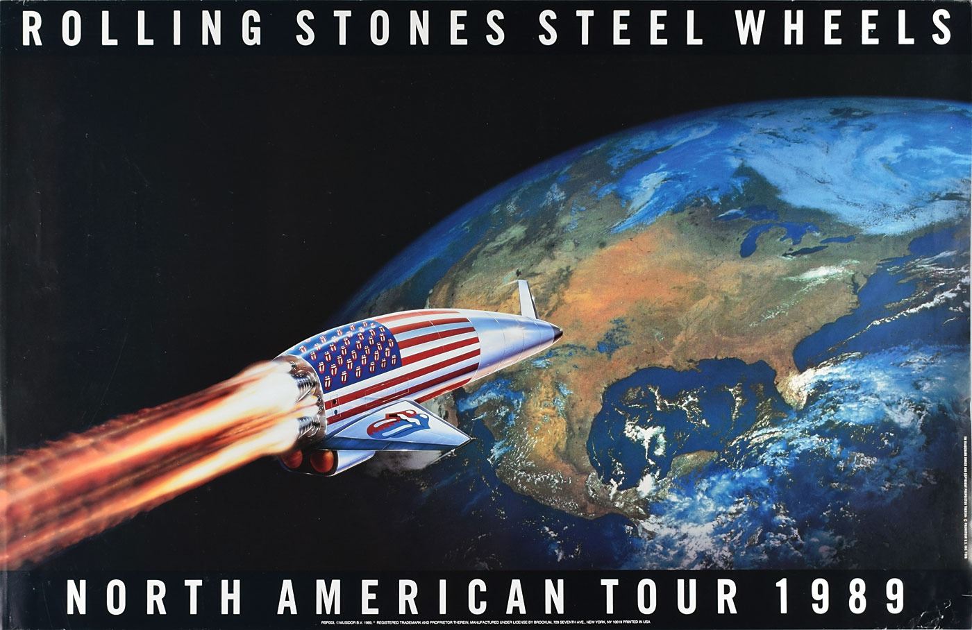 Highly appealing original 34.5 x 22.25 tour poster promoting the North American leg of the Rolling Stones' 1989 Steel Wheels Tour, which shows a patriotic spaceship with 'hot lips' logos zooming towards North America. In fine condition, with some light creasing.