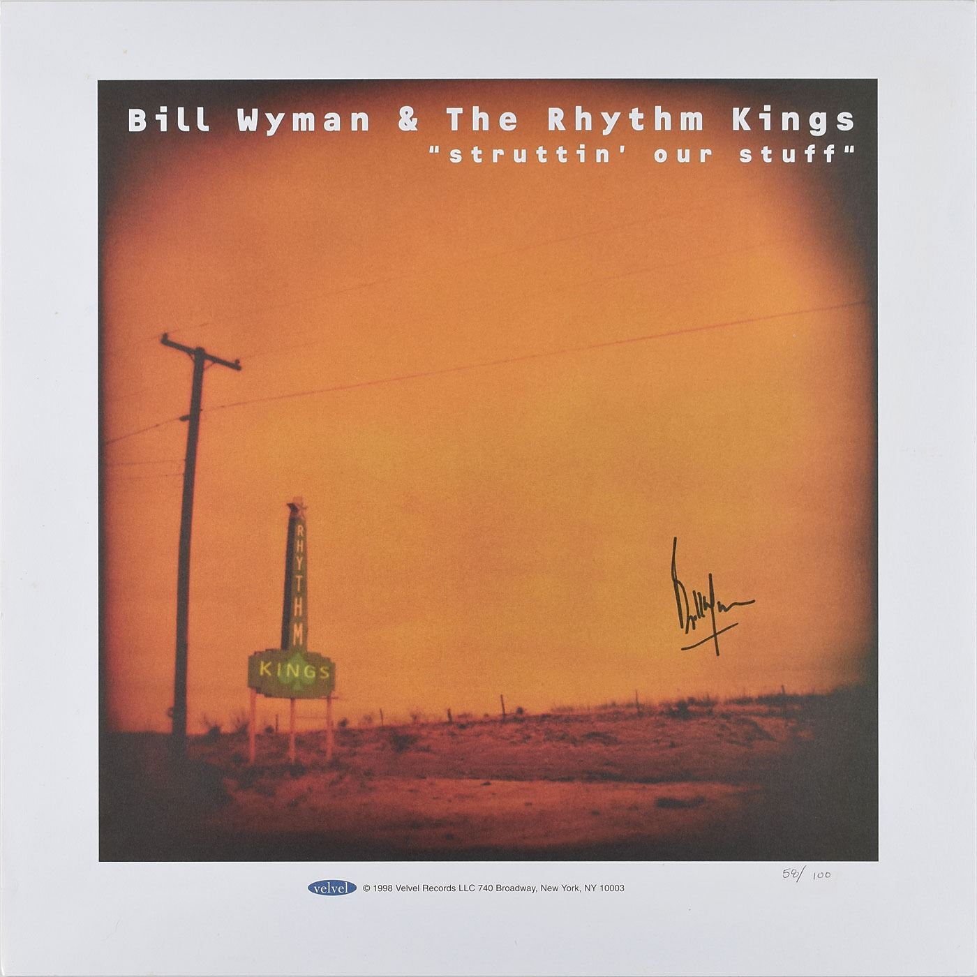 Limited edition color 15 x 15 print issued by Velvel Records for the release of Struttin' Our Stuff, the debut album from Bill Wyman's Rhythm Kings, numbered 58/100, signed in black felt tip by Wyman. In fine condition.