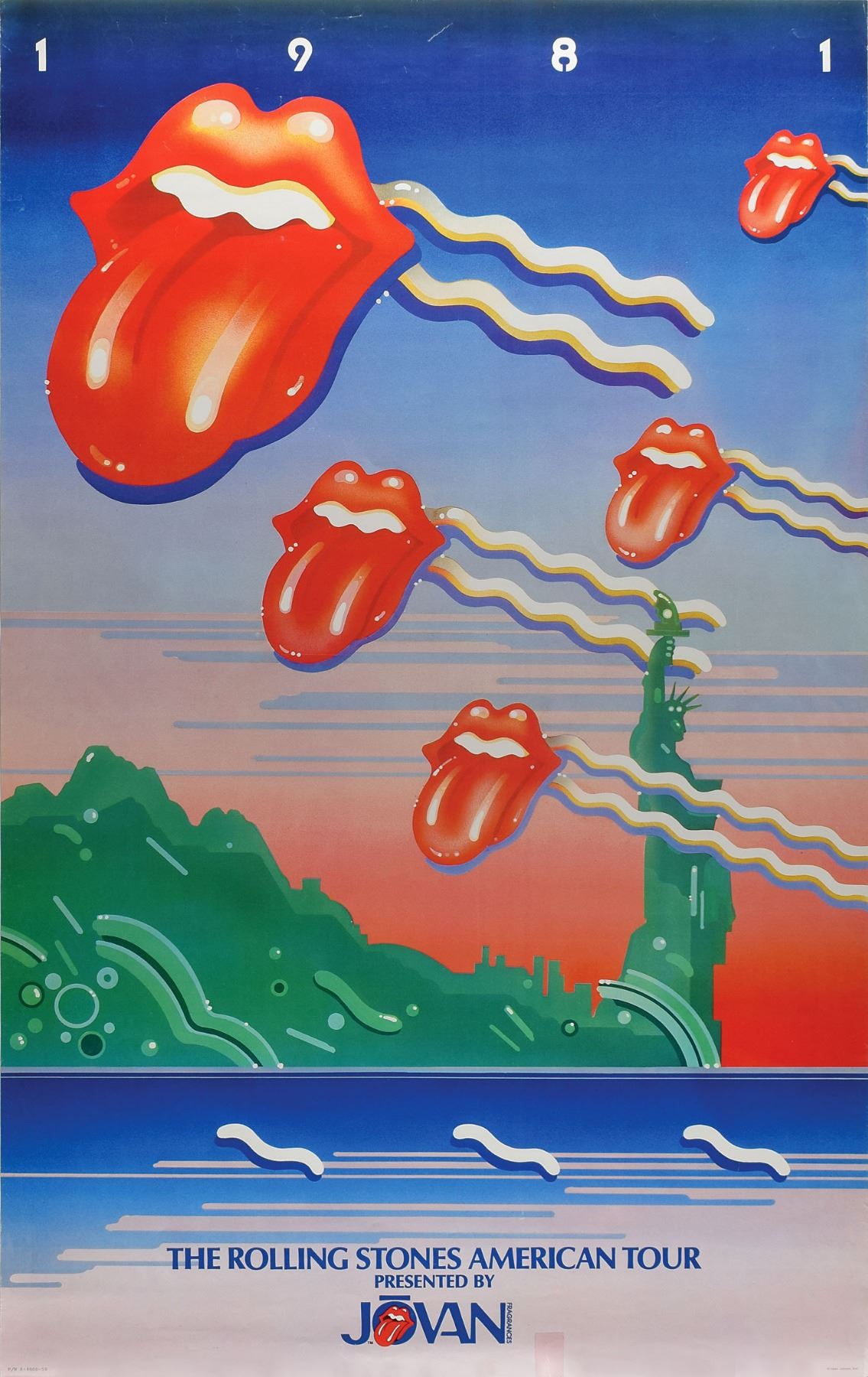 Original 22.75 x 36 poster for the Rolling Stones' 1981 American Tour issued by Jovan Fragrances, showing several floating 'hot lips' logos against a Statue of Liberty backdrop. The Rolling Stones introduced corporate sponsorship to the touring business when they announced their partnership with Jovan. This poster was distributed at shows on the tour and used at retail. In fine condition, with scattered light creasing.