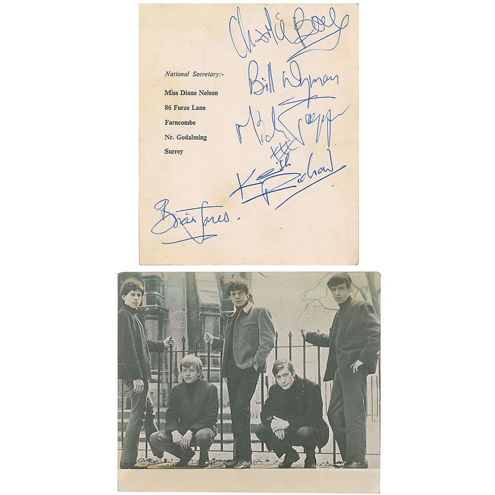 Fantastic vintage circa 1963 Rolling Stones fan club promo card (the earliest form of a Stones fan club card), 5.5 x 4.5, signed on the reverse in blue ballpoint, "Mick Jagger, xxx," "Brian Jones," "Keith Richard," "Charlie Boy," and "Bill Wyman." Caption on reverse lists the address of fan club national secretary Diane Nelson. In fine condition. A hugely desirable cast of very early, very bold Stones signatures. Accompanied by an original concert program from the Rolling Stones' first tour (as a supporting act for The Everly Brothers/Bo Diddley/Little Richard), a photo of the original concert handbill, and a letter of provenance from the original recipient, which reads, in part: "I can verify these autographs are original as I collected them myself whilst I was a member of the Blue Stars pop group playing the Ma Regan circuit around the Birmingham area…We were a support band for all the visiting artists, along with other local groups. We used to sit around in the dressing room before going on stage, chatting as one does, this gave us ample time to obtain autographs. I had the privilege of meeting the Rolling Stones along with The Beatles, The Searchers, The Hollies, Freddie and the Dreamers, and lots lots more." Also accompanied by a certificate of authenticity from Tracks noting that the signatures were "obtained at the Plaza Ballroom, Old Hill, Birmingham on August 10th 1963."