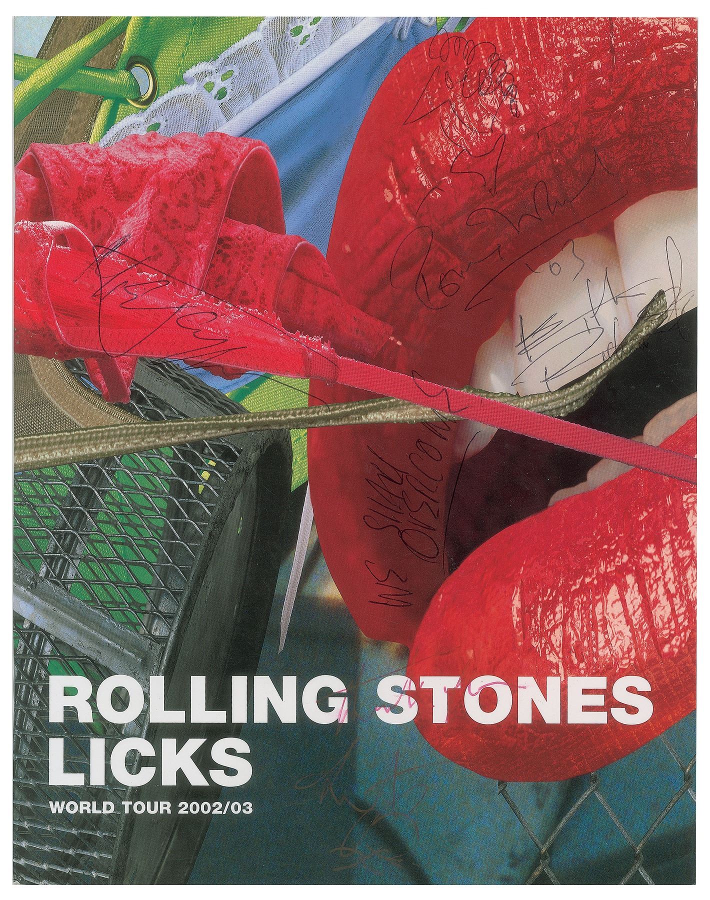Official souvenir program for the 2002-2003 Licks Tour by the Rolling Stones, 36 pages, 9.25 x 11.75, signed on the front cover in black ballpoint, "Mick Jagger," "Keith Richards," and "Ronnie Wood, '03," who adds a sketch, and in red ink, "Thank you, Charlie Boy, xxx," with one of the musicians adding, "We shall overcome." The first page of program also signed by tour musicians Bobby Keys, Blondie Chaplin, and Bernard Fowler. In fine condition, with moderate signature contrast.