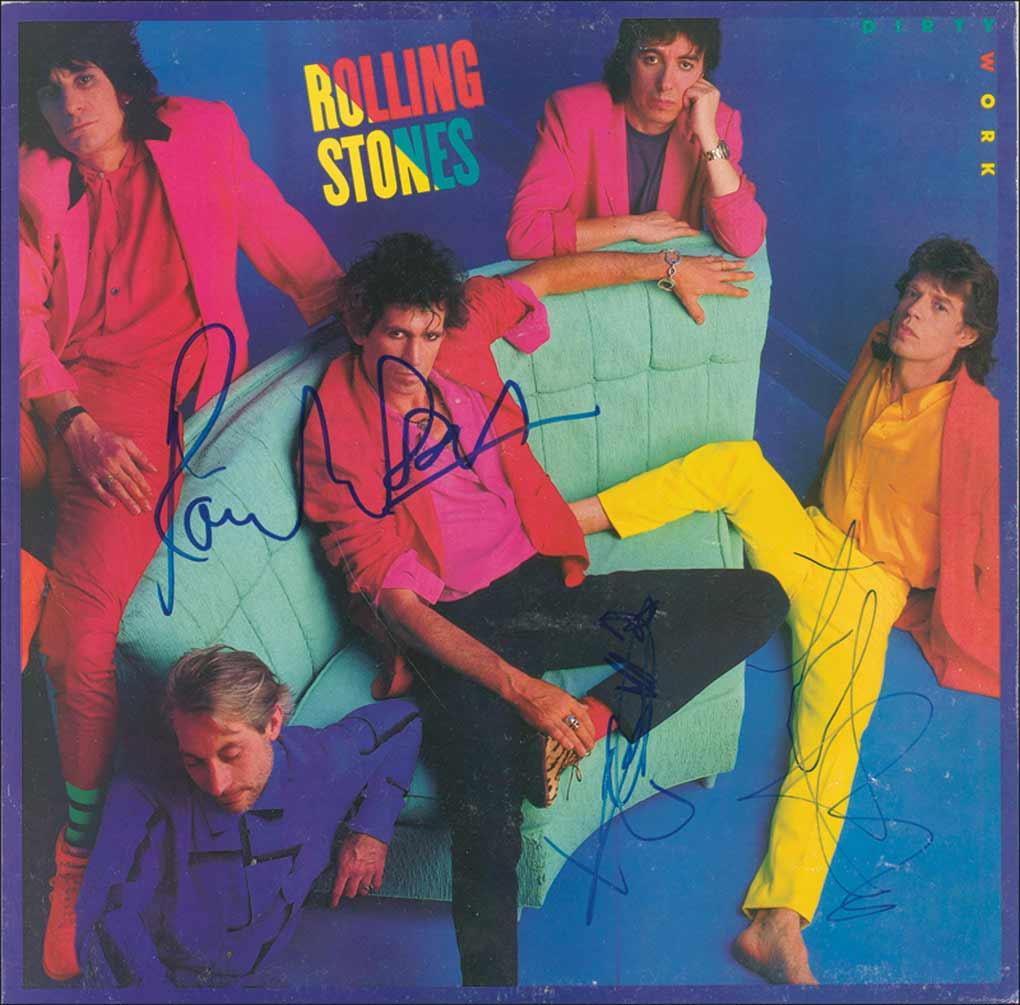 Dirty Work album signed on the front cover in blue felt tip by Keith Richards, Charlie Watts, and Ron Wood. In fine condition, with some scattered light cover wear, light contrast to portions of Richards’s signature and some brushing to Wood’s signature. The record is included.