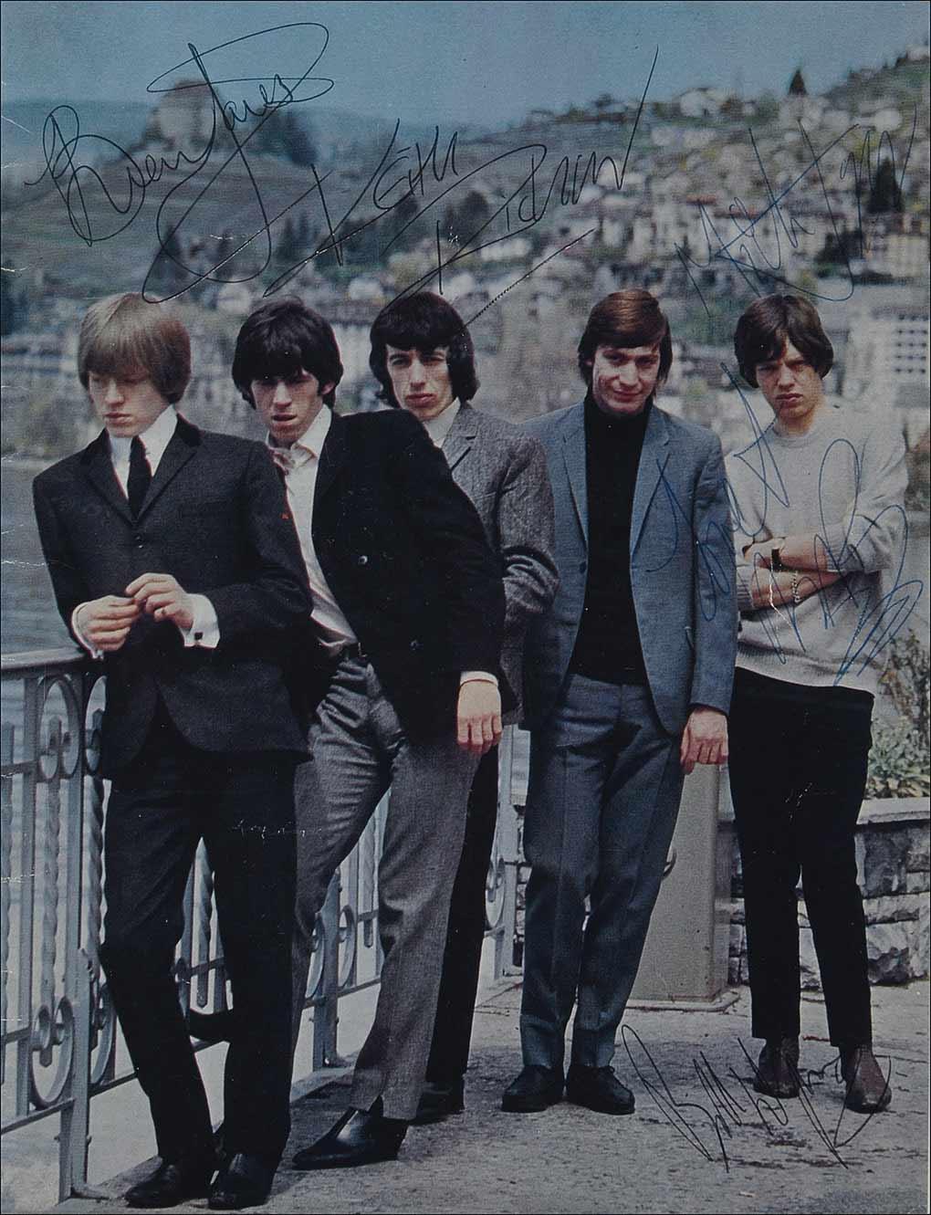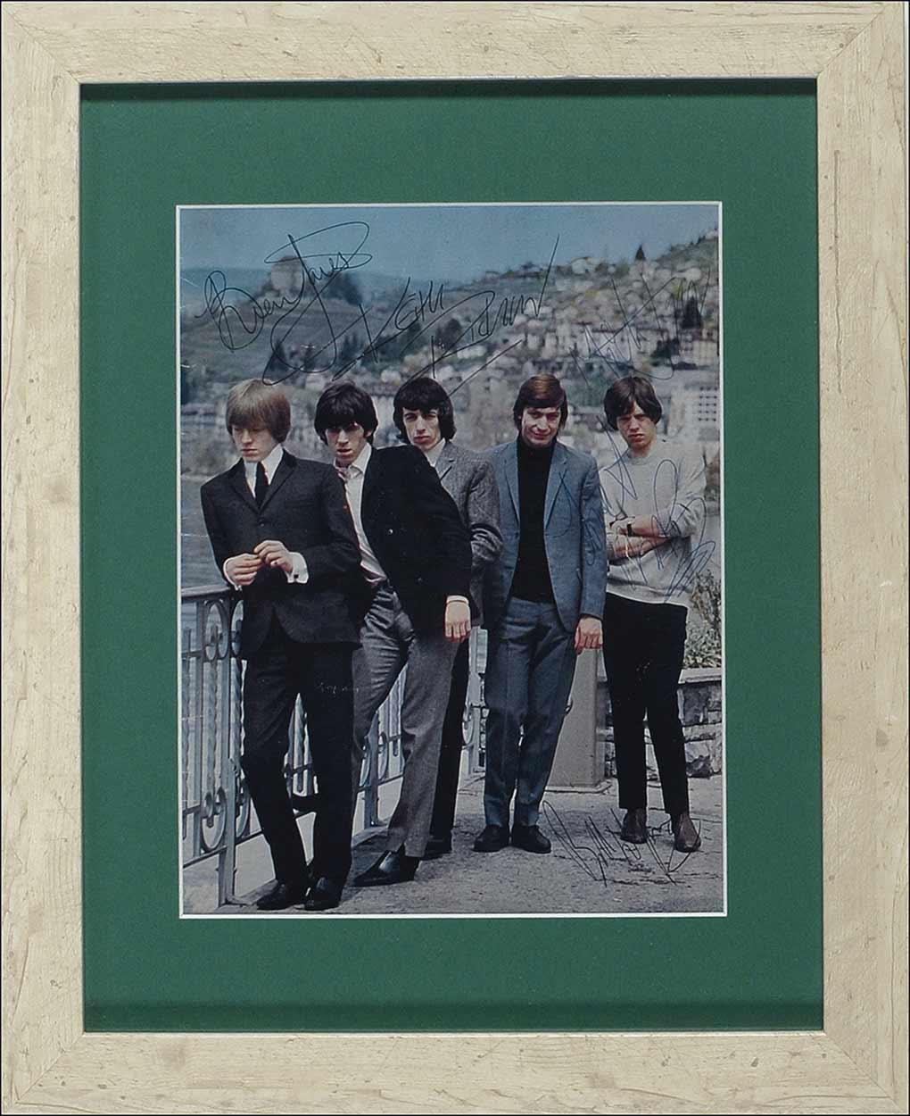 Outstanding and rare color vintage 8 x 10.25 signed concert program photo of the five original Stones posing at the seashore, signed in black ink by Brian Jones, Keith Richards, and Bill Wyman, and in blue ink by Mick Jagger and Charlie Watts. Matted and framed to an overall size of 13 x 16. In fine condition, with a few light creases to left edge, and a couple small surface abrasions, none of which detract from the fabulous overall appearance and very strong signatures. Signed color photos of the original band, including Brian Jones, represent one of the most coveted prizes in all of rock and roll.