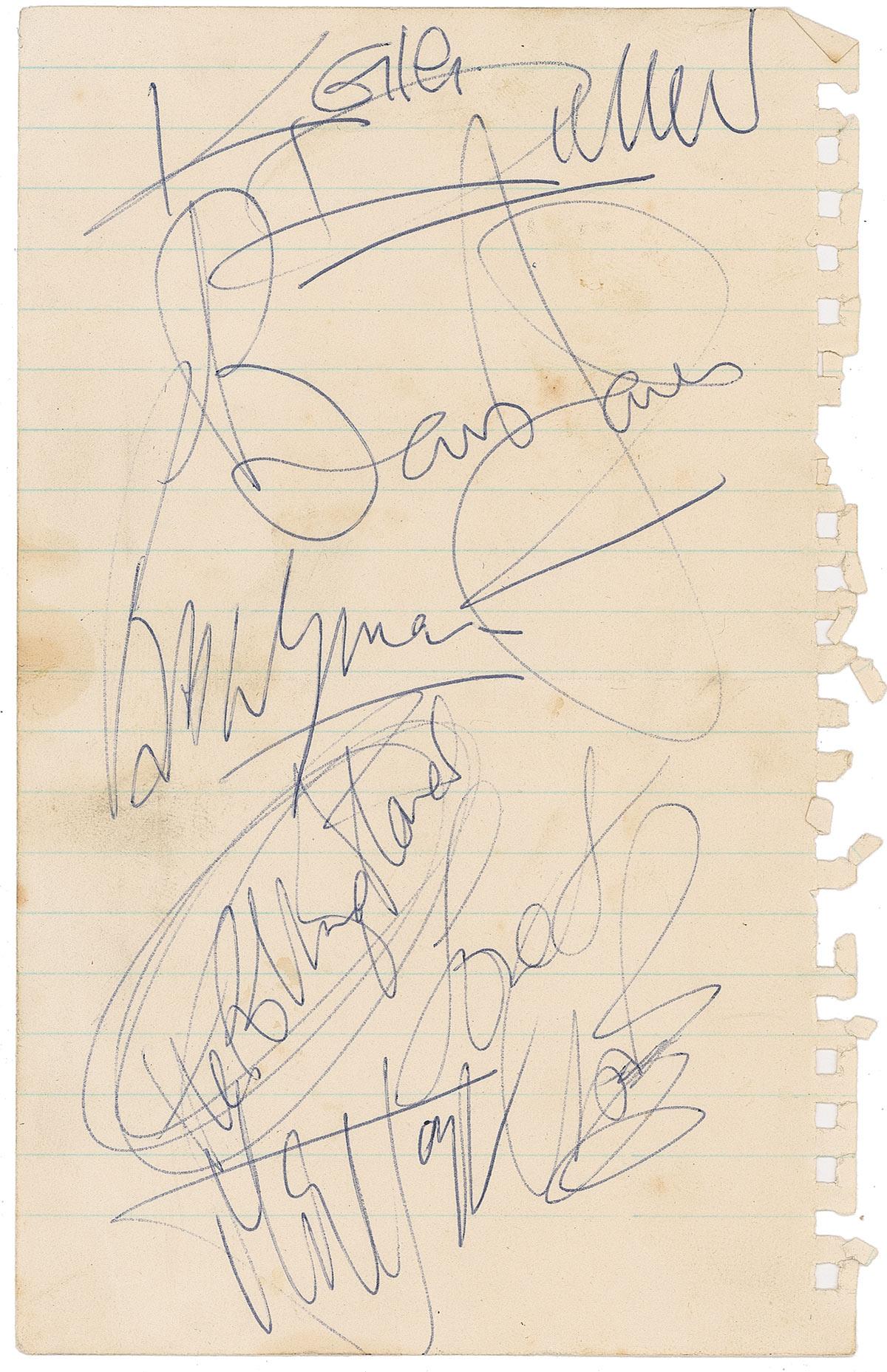 Vintage ballpoint signatures of Mick Jagger, adding “The Rolling Stones,” Keith Richards, Brian Jones, Bill Wyman, and Charlie Watts on an off-white 4 x 6.25 lightly-lined notebook sheet. Signatures were acquired by a 15 year old female fan backstage after a 1964 concert at the Gaumont Theatre in Southhampton. In fine condition, with rough right edge from removal from notebook, bisecting horizontal fold, and some scattered mild toning and foxing. Accompanied by a letter of provenance from the fan who originally acquired the signatures. Pre-certified Roger Epperson/REAL and RRAuction COA.