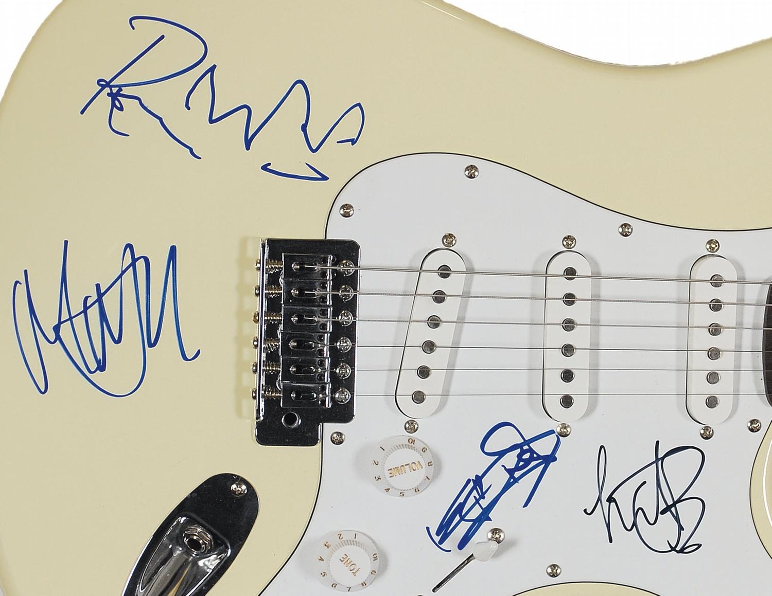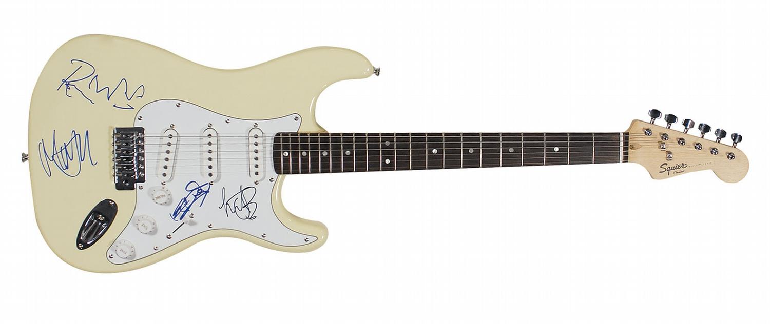 Cream-bodied Fender Squire electric guitar, signed on the body in blue felt tip by Mick Jagger and Ron Wood, and on the white pickguard in blue felt tip by Keith Richards and black felt tip by Charlie Watts. In fine condition.