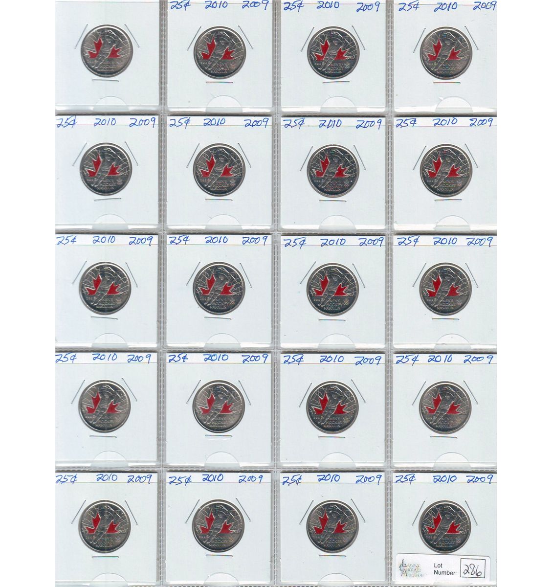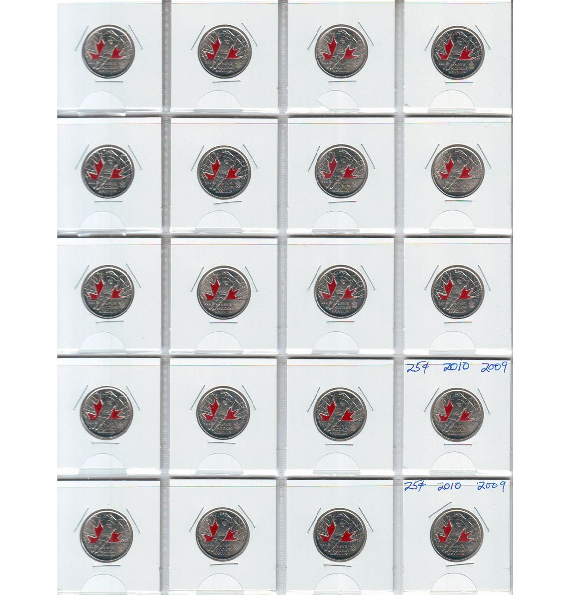 Rolls: 1 x 25 cents 2009 Men's Hockey all Colored and Incused 2 and all in 2x2 in pages. Lot of 40 coins.