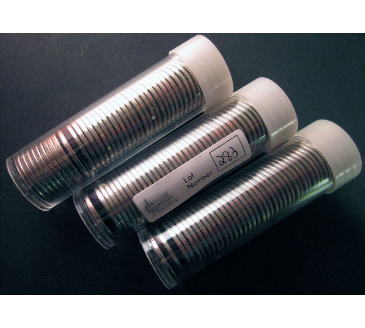 Rolls: 3 x 5 cents 1964 Uncirculated. Total of 120 coins in plastic tubes.