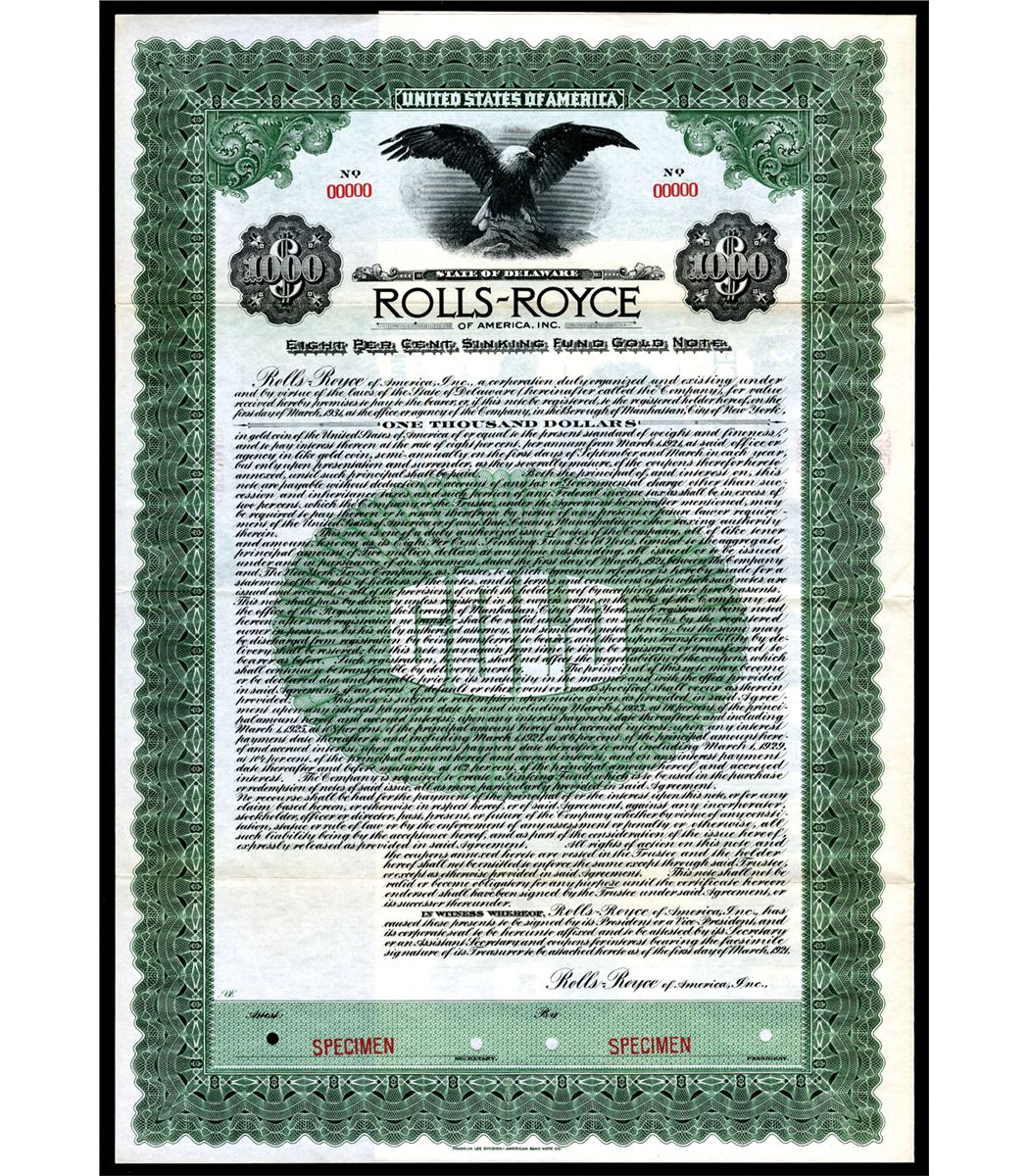 1921, $1000 8% Specimen Bond, Black print with green border and underprint, Bald Eagle vignette top center, POC's with red SPECIMEN overprints, VF-XF condition, FLABNC.