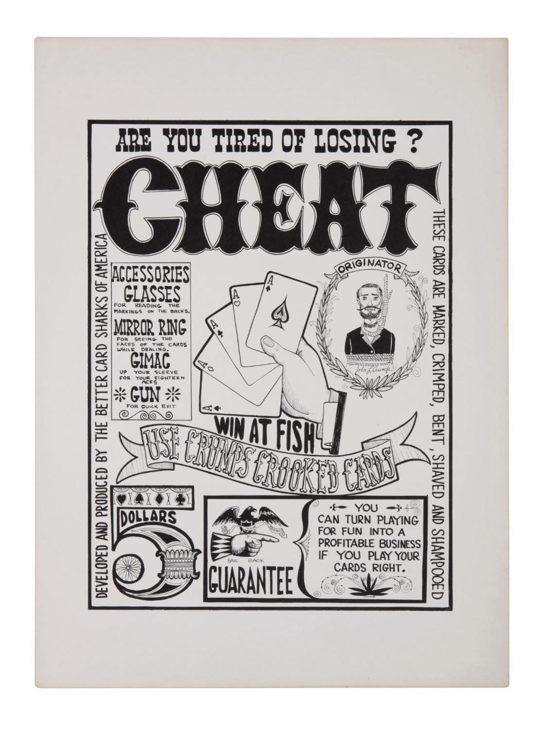(Crump, c.1957) A vintage poster print by Disney artist and Imagineer Rolly Crump titled "Cheat." Crump's tongue-in-cheek artwork becons the reader, "Tired of losing? Cheat" with a plethora of graphics and sayings throughout that are instantly recognizable as Crump's familiar illustration style. The poster measures 20.5"x15" and is in very good condition with minor edge wear.