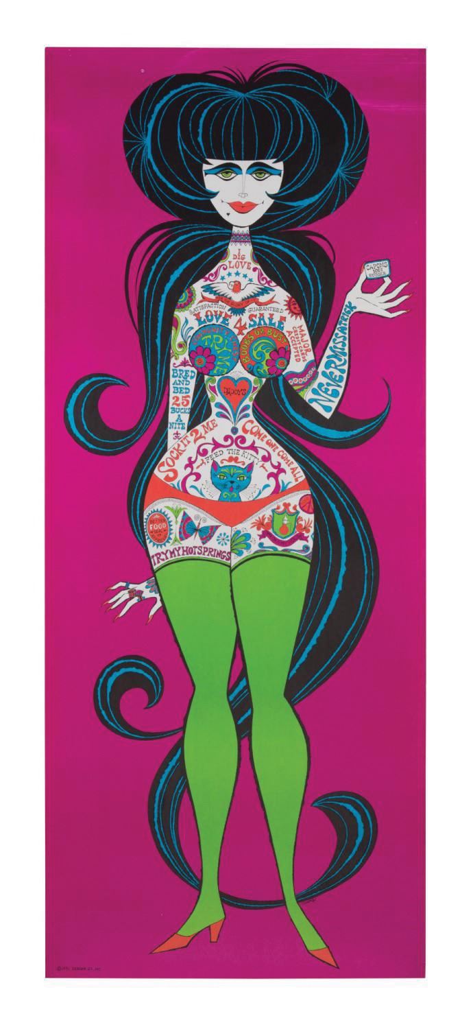 (Crump, 1971) A vintage lithographic poster print by Disney artist and Imagineer Rolly Crump, titled "Kitty Galore." Heavy in psychedelia and double entendres, Crump engages with the spirit of the times in this beautiful full-length portrait of a liberated love goddess. Measuring 57.5"x24", the poster is in good condition with some general edge and surface wear, and some variances in the color tone from the printing process.
