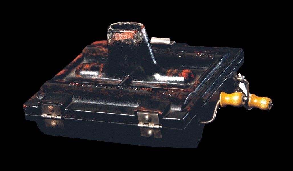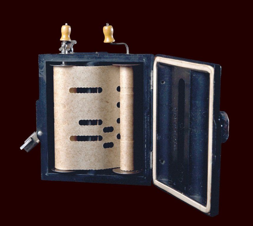Rolmonica. Automatische Mundharmonika mit eingebauter Notenrolle und Kurbel für den Antrieb. Museumsqualität. 13,5 x 9 x 8,5cm. Rolmonica Music Company, Baltimore, USA, circa 1928.