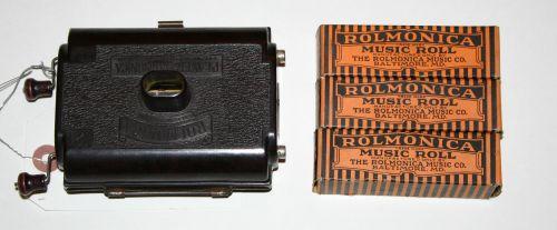 Rollmonica trademark playing harmonica musical instrument with three rolls in original boxes: R-413 Sunbonnet Days, R-405 Here Comes the Show Boat, R-380 Make Believe, c 1928. Play crank does not engage when turned. One half of case is metal, the other is hard plastic.
