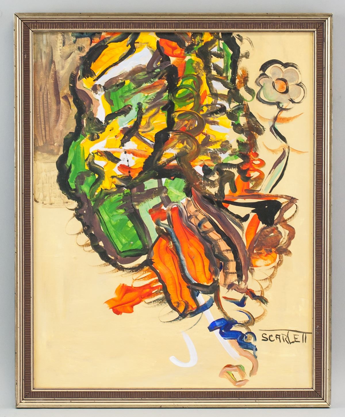 Oil on canvas, framed. Featuring an abstract still life composition. Signed SCARLETT on the lower right corner. Attributed Rolph Scarlett (1889-1984, Canadian). 51 x 40 cm (20 x 15.5 inches), Frame: 56 x 45 cm (22 x 17.5 inches). Provenance: This lot carries limited provenance from a Southern Ontario estate