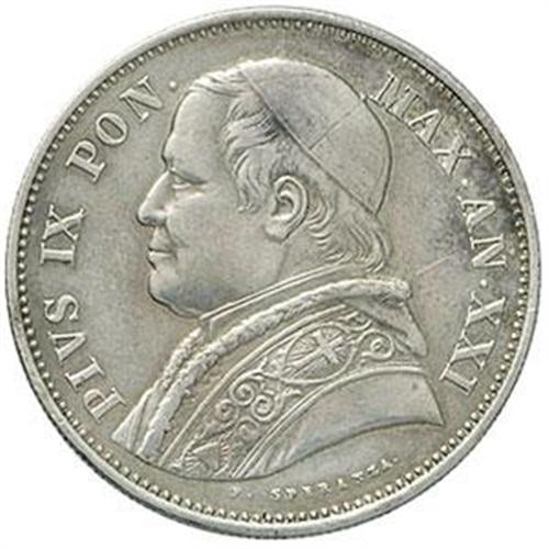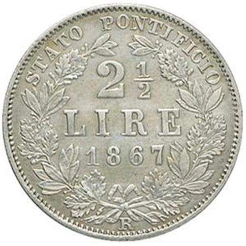 Roma. Pio IX (1846-1870). 2 lire e mezza 1867 A. XXI. Pag. 552. NC. AG. BB.
