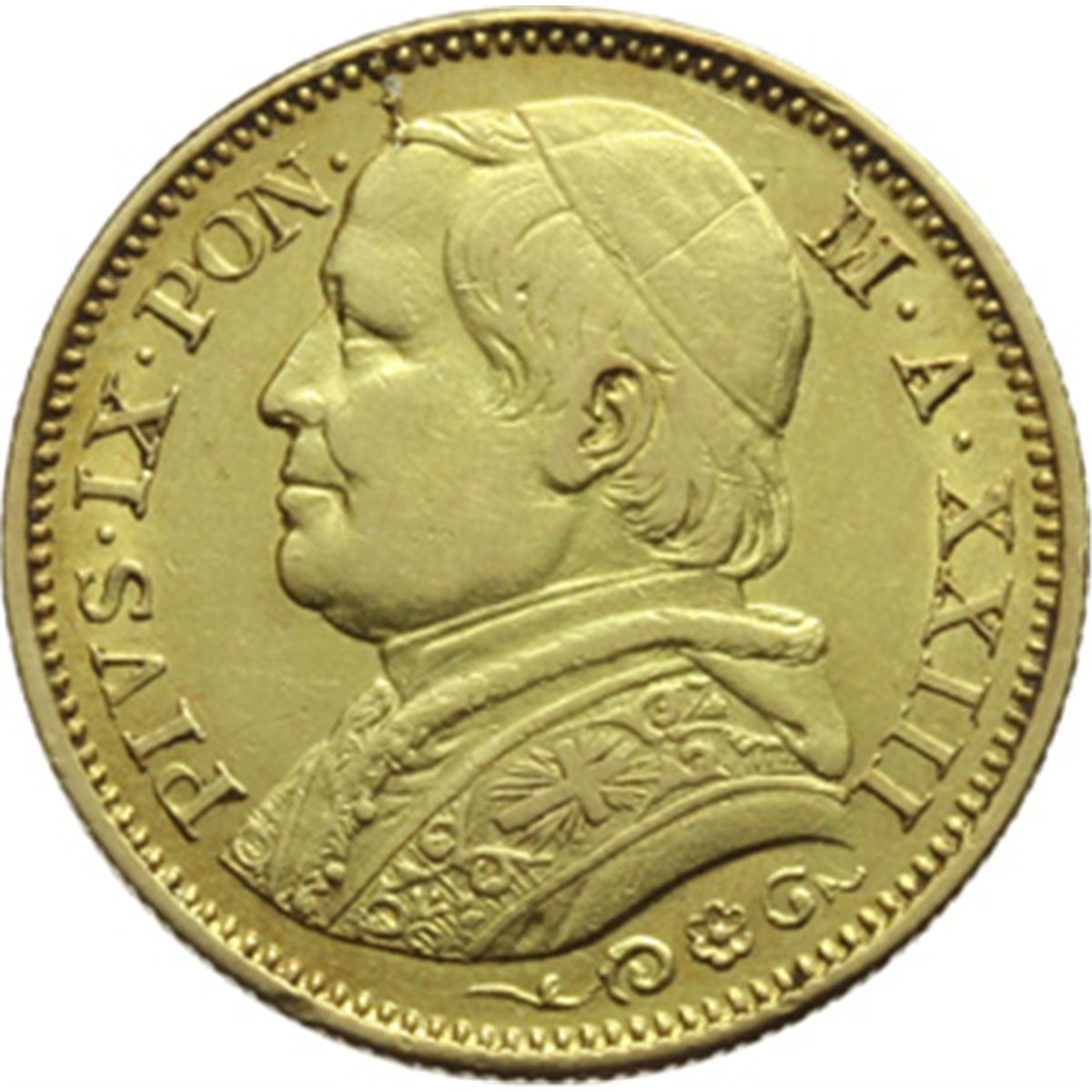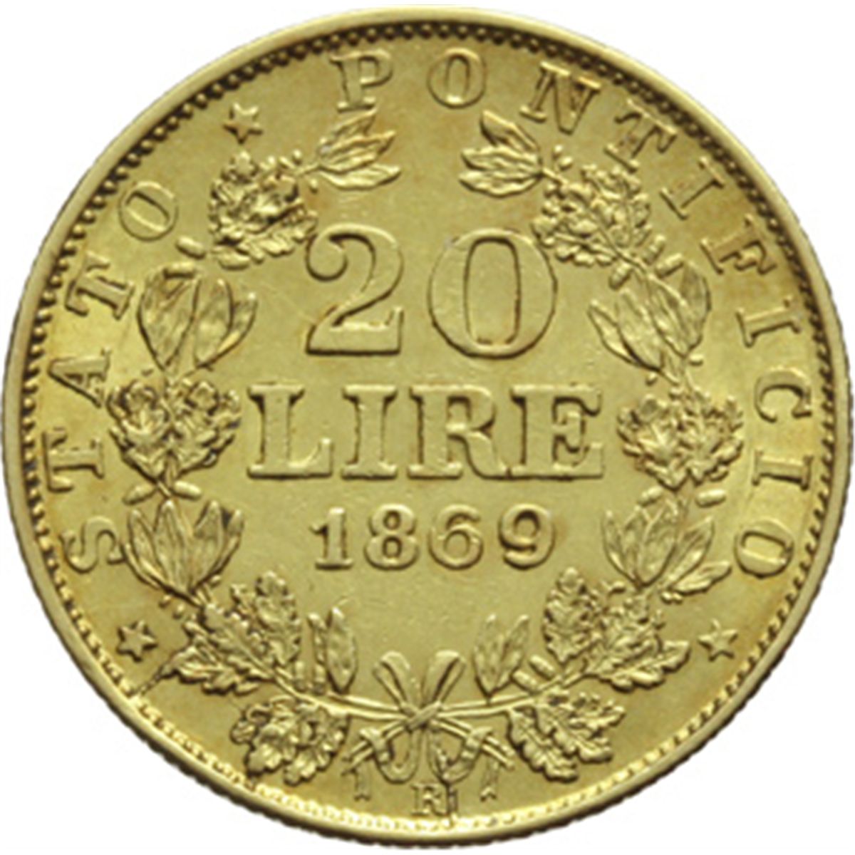 Monete e Medaglie di Zecche Italiane. Roma. Pio IX (1846-1870). 20 lire 1869, A. XXIII. Pag. 536. Mont. 352. AU. qBB/BB+.