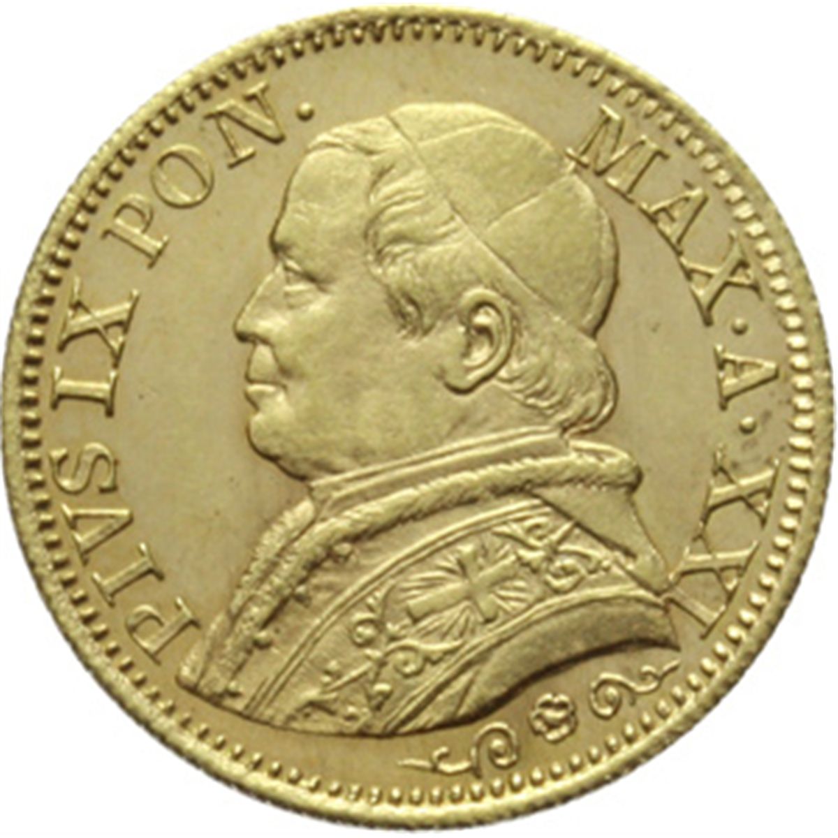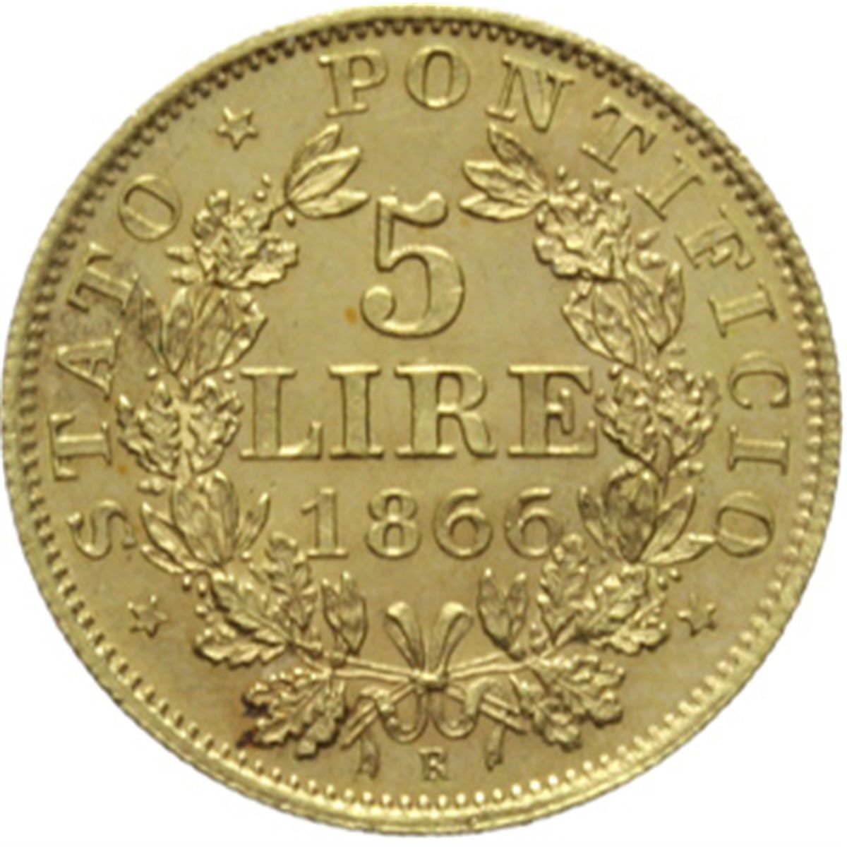 Monete e Medaglie di Zecche Italiane. Roma. Pio IX (1846-1870). 5 lire 1866, A. XXI. Pag. 545. Mont. 359. AU. RR. Lievissimi segnetti da lucidatura, altrimenti SPL+/qFDC.