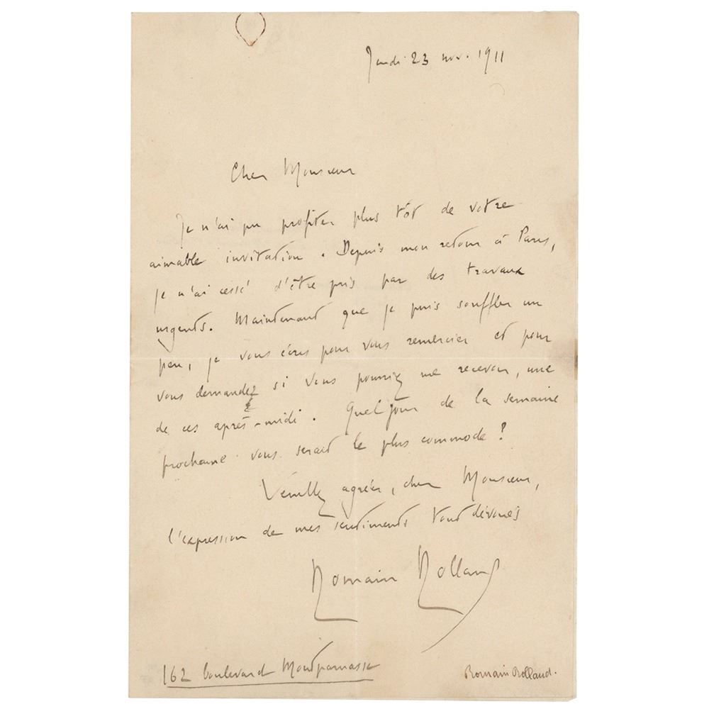 ALS in French, one page, 5.25 x 8, November 23, 1911. Untranslated handwritten letter by Rolland, responding to an invitation. In fine condition, with a small rusty paperclip impression to the top edge.