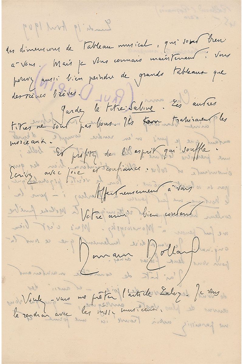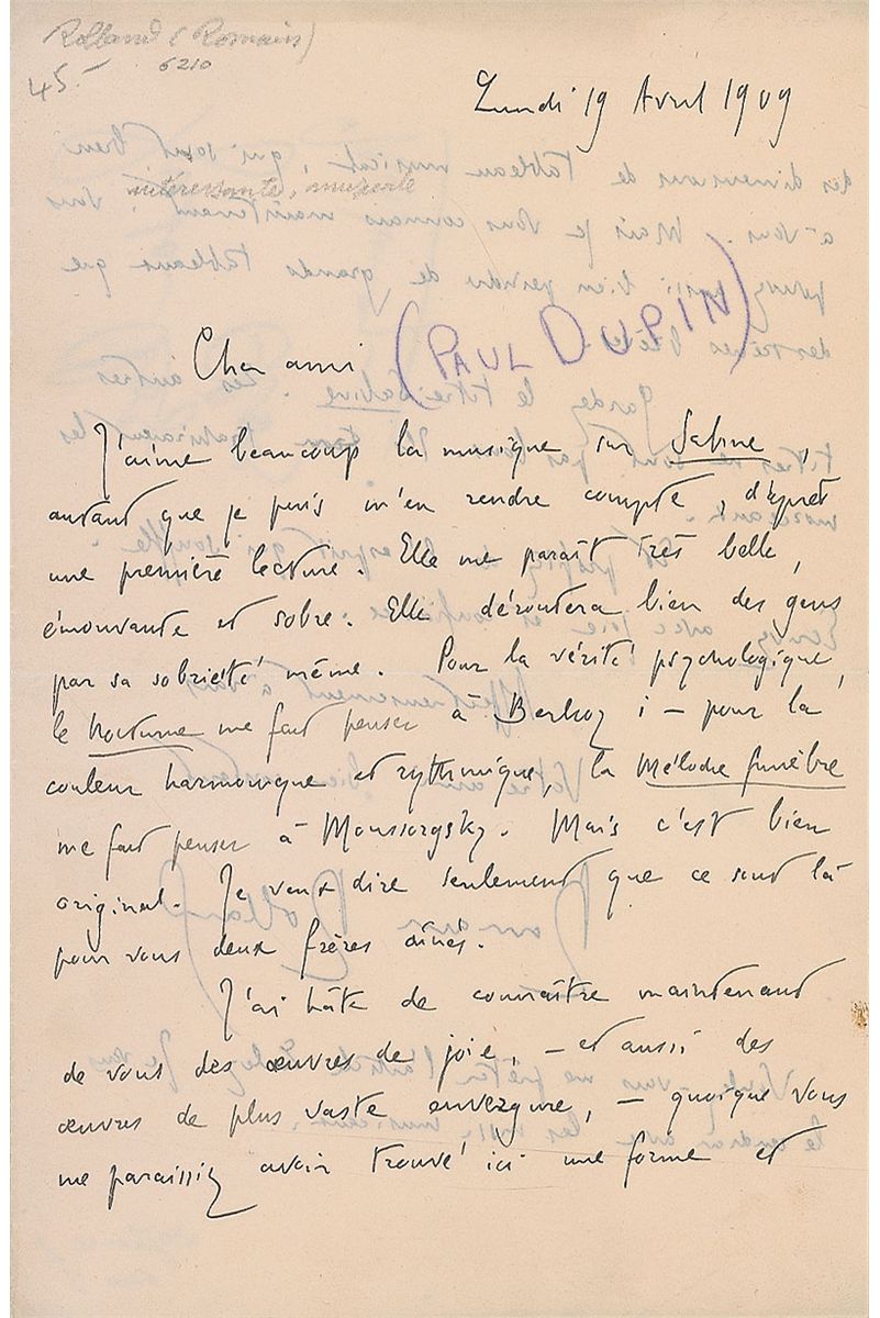 French writer who won the 1916 Nobel Prize for literature. ALS in French, one page both sides, 5.5 x 8.25, April 19, 1909. Written to composer Paul Dupin (1865-1949), whose work “Sabine” sounds to him, “as very beautiful, moving and sober music, and will