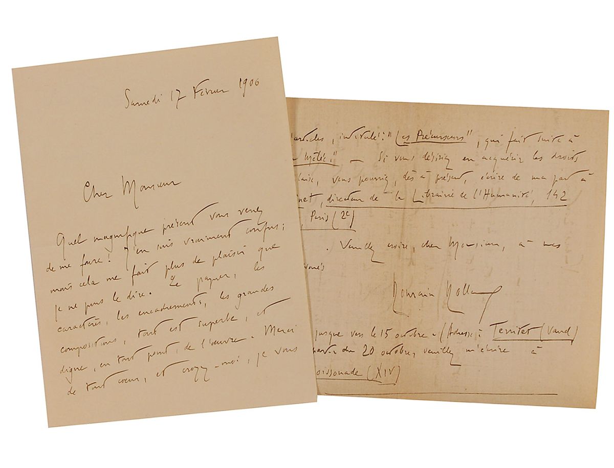French writer who won the 1915 Nobel Prize for literature. Two ALSs in French: one is one page, both sides, 5 x 6.5, February 17, 1906. In part (translated): “What a splendid present you’ve just given me!…the characters, the framing, the great compositions, everything is superb and Worthy of the work, in every respect.”; second letter is three sides of two adjoining sheets, 5.25 x 7, October 2, 1919, to an unidentified gentleman. In part (translated): “My letter to you concerning Colas Breugnon. You talk of my Liluli which The Nation is now publishing in English translation…I’d be glad to come to terms with you about publishing the volume in England; but I must tell you that I’ve had an offer for the US. For publication in England and the British Empire. I want 10% per copy, payable at each new printing. I haven’t yet determined the quality of the English translation published in The Nation. I’ve just read the first few pages; overall, the style seemed satisfactory, although some errors will have to be corrected. I’ll have to see the whole translation and have it checked by English author friends of mine. A very important characteristic of Liluli is its poetic rhythm. A faithful poetic copy is almost impossible but at least some English equivalent must be given. Because you are the English publisher of my ‘Above the Battle’…you should be interested in my volume of articles ‘The Precursors’-If you wish to acquire the rights for an English edition…Write to…la Libraire de L’Humanite.” In fine condition, with uniform toning to second letter.