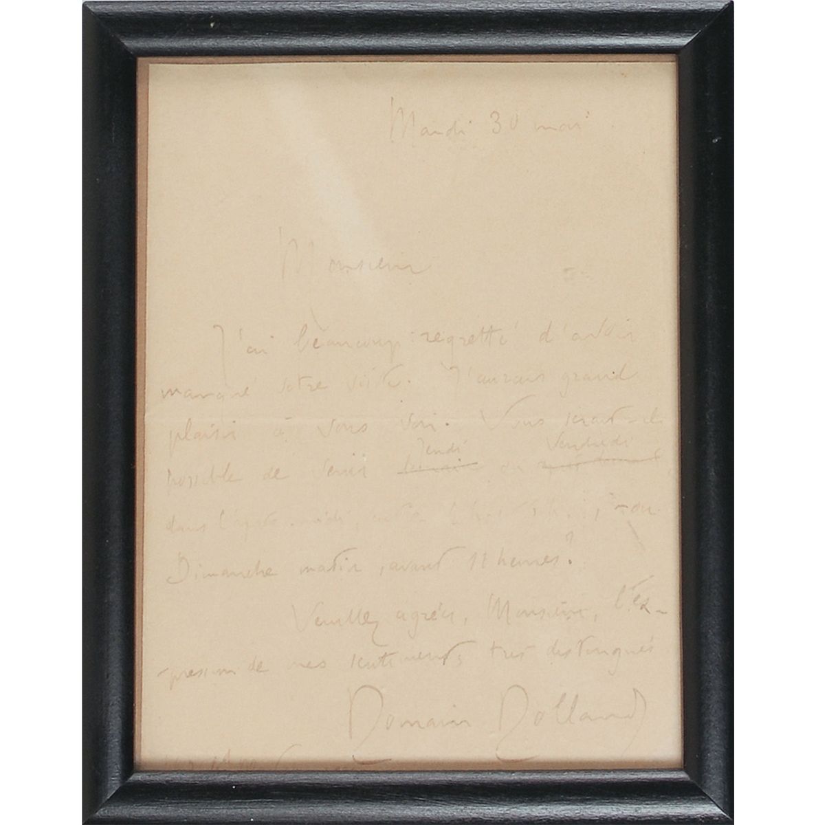 French writer (1866–1944) who won the 1915 Nobel Prize for Literature. ALS in French, one page, 4.75 x 6.25, March 30. Untranslated letter arranging a meeting. Framed to an overall size of 5.75 x 7.25. In very good condition, with overall toning, a couple creases, and writing a few shades light.