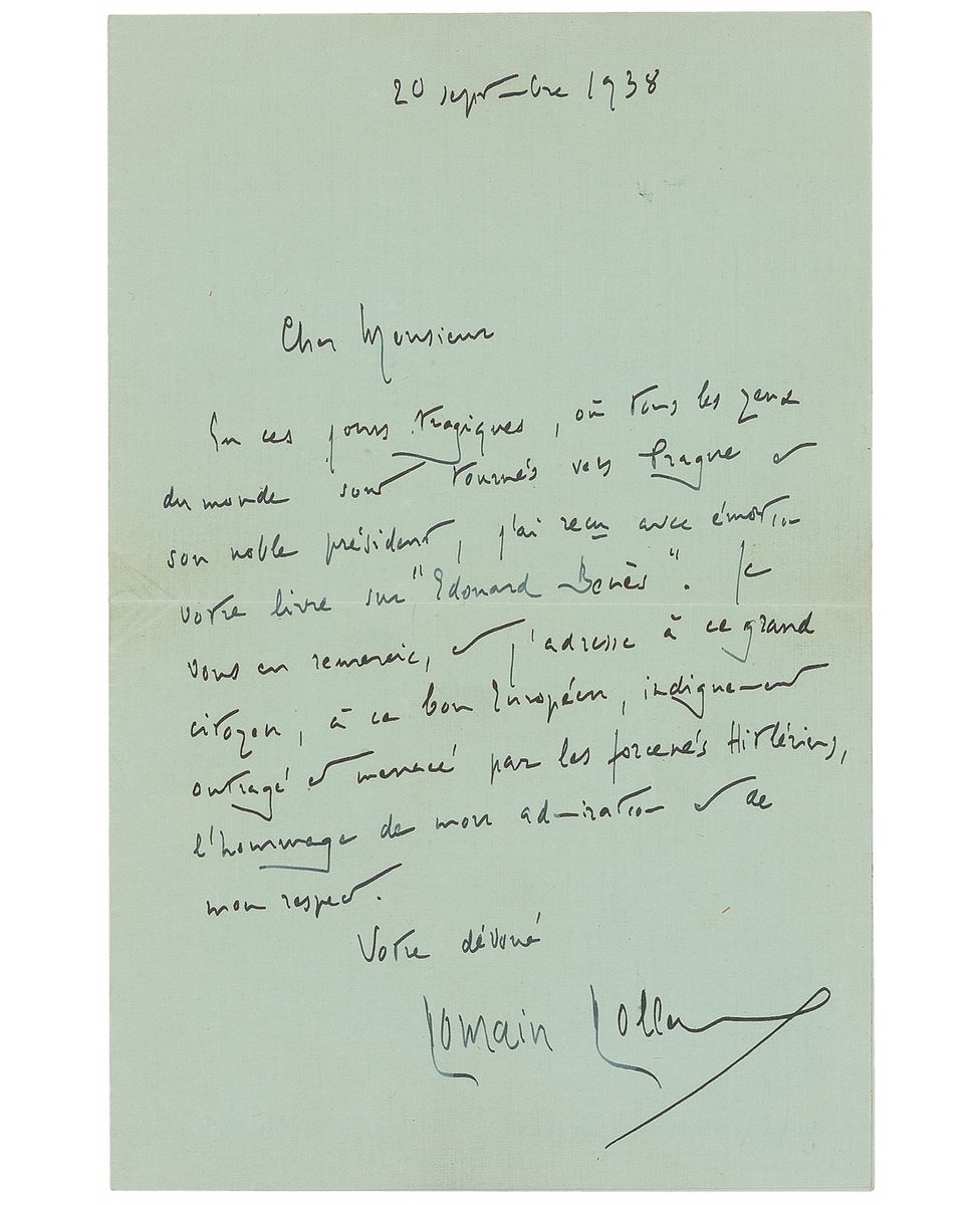 ALS in French, one page, 5.25 x 8.25, September 20, 1938. Untranslated letter to the German writer and journalist Heinz Stroh in Prague, who had sent him his biography on Edvard Benes. In fine condition. Accompanied by the original mailing envelope, addressed in his own hand.