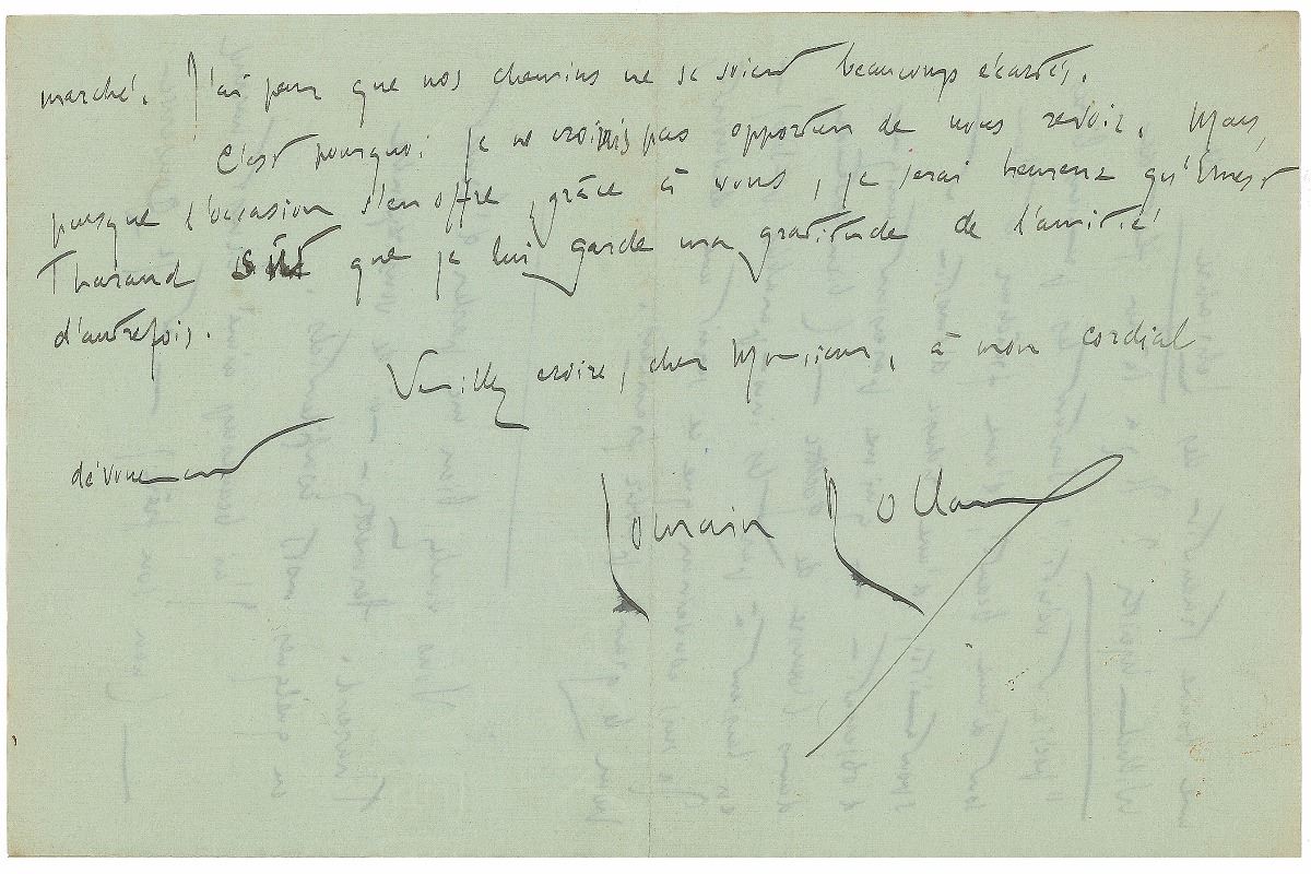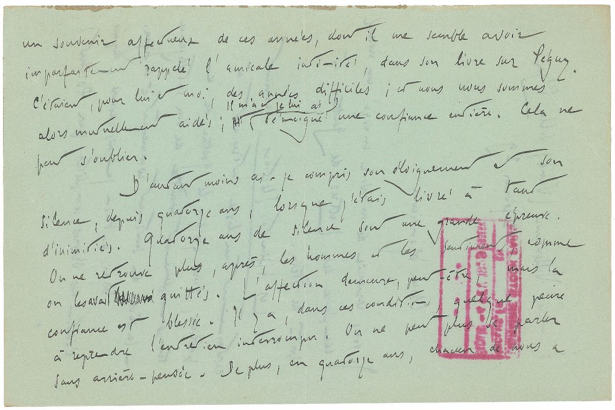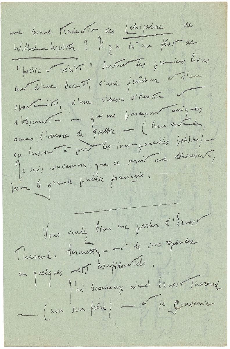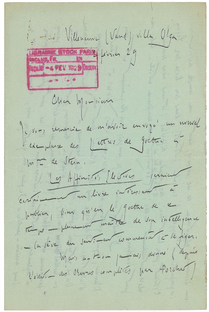 ALS in French, four pages on two adjoining sheets, 5.5 x 8.5, February 4, 1929. Letter to Maurice Delamain of the Stock publishing house, in part [translated]: “I thank you for having sent me a new copy of Goethe’s letters to Mrs. Von Stein. ‘Elective Affinities’ would certainly be a very interesting book to publish even if in Goethe’s work of this time, who was in full command of his intelligence, the sap of sentiment began to congeal. But has anyone ever accomplished a good translation of ‘Wilhelm Meister’s Apprenticeship’? You find therein a flow of ‘poesy and trueness.’ Especially the first books are extremely beautiful, fresh, spontaneous and abundant with emotion and observation—all of which appears to me unique in Goethe’s oeuvre (if you don’t count his unparalleled poems, of course). I am convinced that this novel would be a discovery for the French public.—You wanted to talk to me about Ernest Tharaud. Please allow me to answer you confidentially. I have loved Ernest Tharaud (his brother) a lot and I cherish a loving memory of the years of intense friendship he is rendering somewhat imperfectly in his book on Peguy. For him as well as for me, these have been difficult years, and we used to help one another then. He has showed me complete confidence—and I him. You cannot forget something like that. This has made his remoteness and his silence of the last fourteen years when I was exposed to such hostilities all the more incomprehensible to me. Fourteen years of silence are an ordeal. Afterwards, you do not recognize the people and their emotions as you had known them previously. The affection might still be there, but the trust is broken. Under these circumstances, it is quite difficult to resume an interrupted conversation. One cannot talk to each other without remembering all this at the back of one’s mind. Furthermore, for fourteen years each of us has moved on. I fear that our paths have diverged a lot. This is why I don’t think it would be advisable that we see each other again. But I would happily embrace the occasion and ask you to let Ernest Tharaud know that I am still very grateful for his former friendship.” Stamped with a Librairie Stock of Paris postmark. In fine condition.