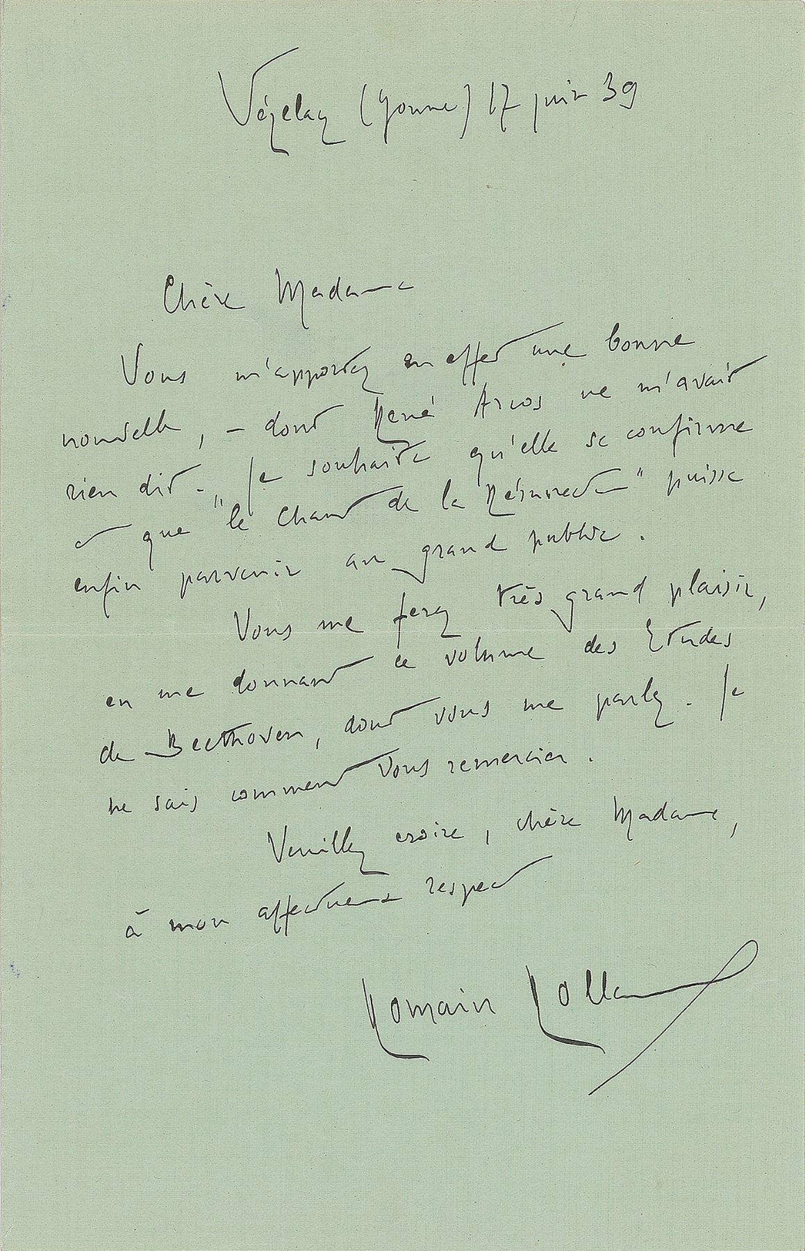 French dramatist, novelist, essayist, art historian, and mystic (1866–1944) who was awarded the Nobel Prize for Literature in 1915. ALS in French, one page, 5.5 x 8.25, June 17, 1939. Letter to a lady on the subject of his biography of Beethoven, originally published in 1903. He is pleased to hear that a new edition will be published, and mentions his work 'Le Chant de la Resurrection,' which has met with great public success. In fine condition.