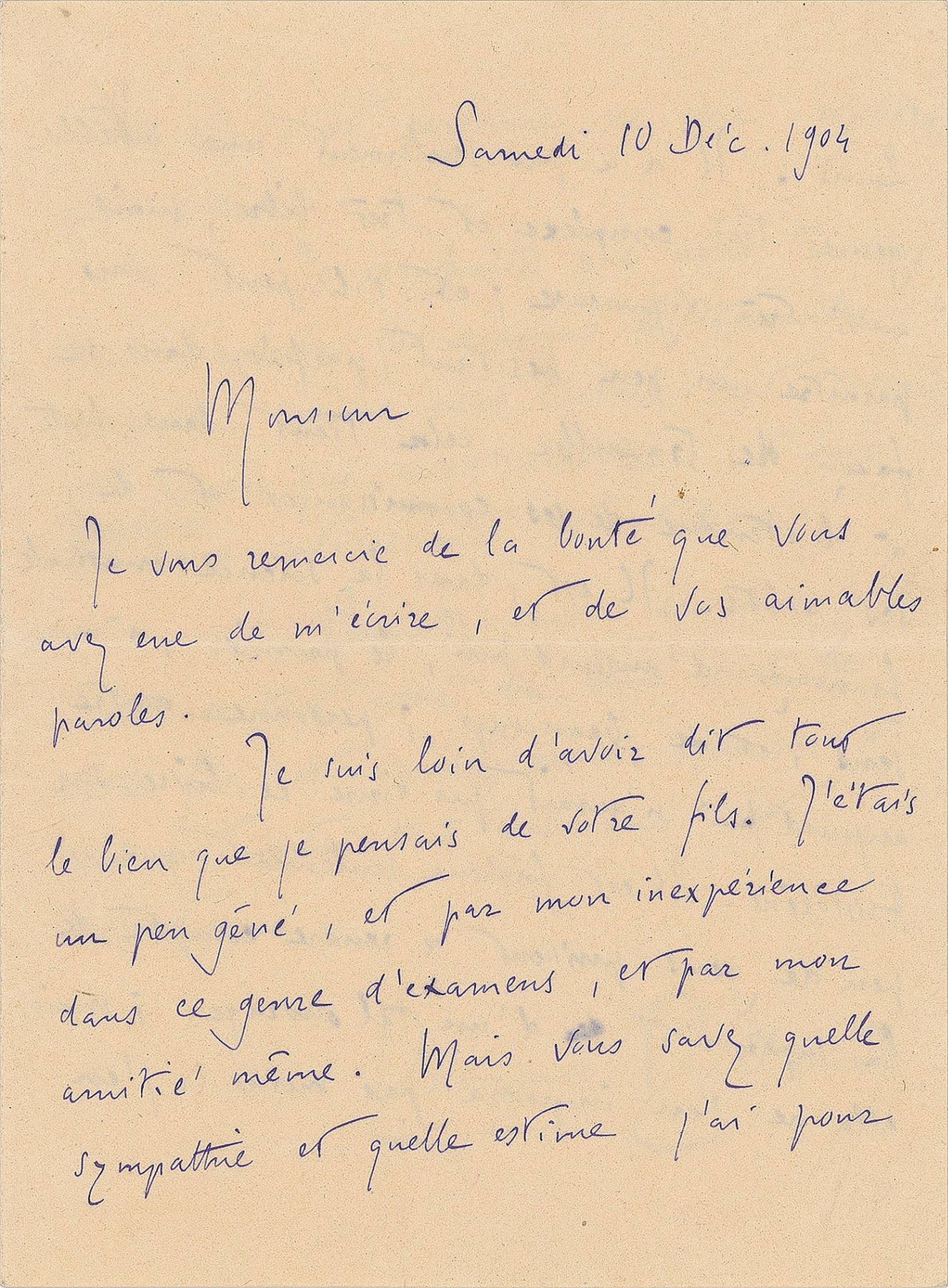 ALS in French, three pages on two adjoining sheets, 4.75 x 6.5, December 10, 1904. Letter to a gentleman whom he thanks for his kind words. Rolland appears to be well acquainted with the recipient and his son, Louis, to whom he extends his esteem and compliments, in part (loosely translated): "He is not only intelligent, but very complex and very free, and very vigorous; if he appears a little hesitant in his style of working, that comes from the understanding of his knowledge and his tastes." In fine condition.