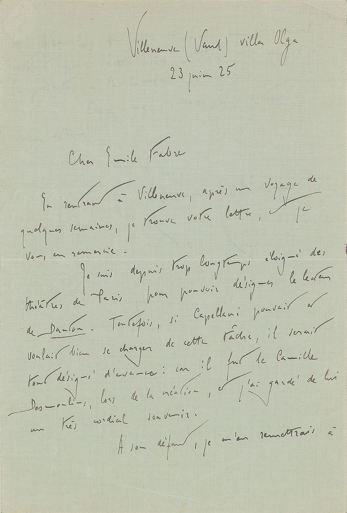 French writer (1866-1944) who won the 1915 Nobel Prize for Literature. ALS in French, two pages on two adjoining sheets, 5.5 x 8.25, June 23, 1925. Written from Villeneuve, an untranslated letter to Emile Fabre in which he relays that he has been removed from the theaters of Paris for so long that he was not able to attend to the 'fixing' of Danton. He suggests that if Capellani is willing and able to have him, he would undertake the task, due to his very cordial memories of him. In fine condition, with some light creasing to the bottom.