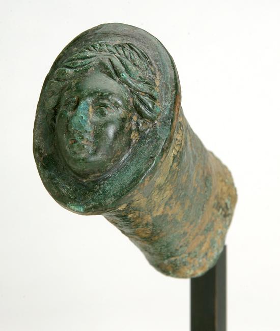 Roman 1st Century A.D. Bronze Hilt of a Sword. Bronze hilt ending in a knob with the face of a woman in high relief. Her hair is parted in the middle. Lovely glossy dark green patina. Length 4¼".