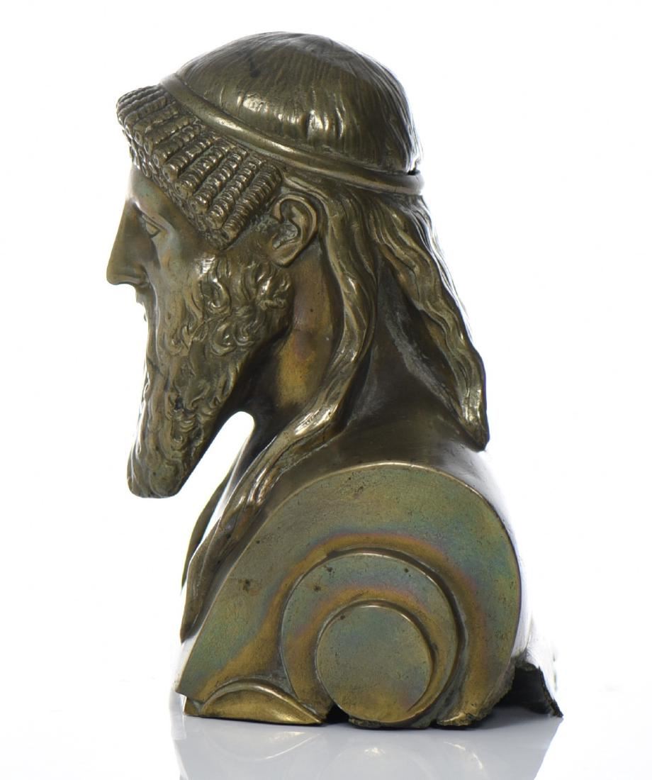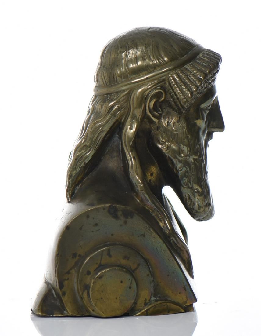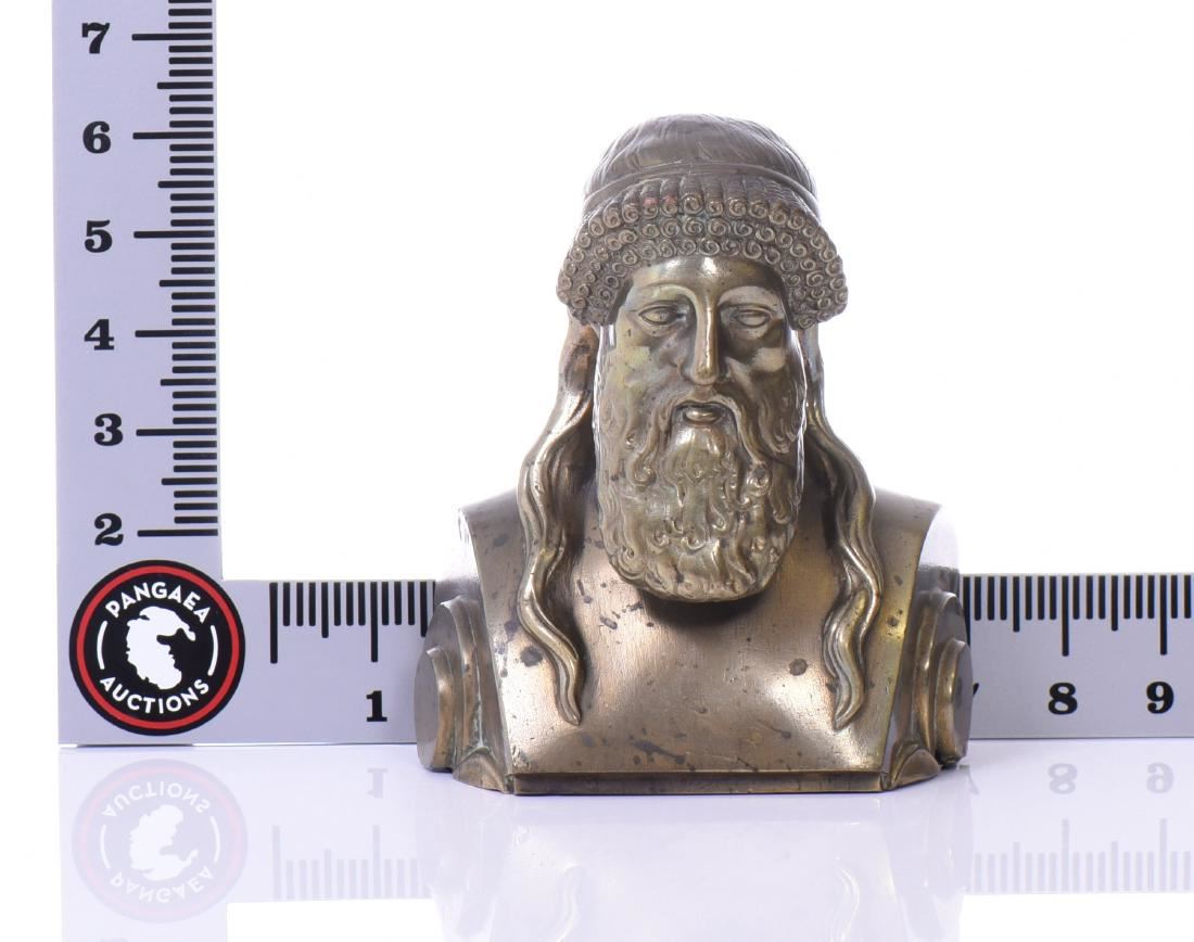 Roman Archaistic Bronze/Brass Herm Of Hermes Propylaios, With Flowing Beard And Hair With Three Rows Of Tight Small Curls And Long Strands Falling Onto His Shoulders. This Bust May Have Been A Spoil Of War That Was Ripped From It's Mounting. The Artist Executed This Sculpture In The Same Style As The Greek Marble Sculptures From The 1St Century A.D. Provenance: Private Collection, New York. Estimated more than 100 yrs old. Italian art dates back to the Ancient Romans who left remains in Italy of extraordinary richness. Italian painting began to develop beyond the influence of Byzantium in the Duecento or 13th century, maintaining its lead throughout the Italian Renaissance, and reaching a particular peak in the High Renaissance of Leonardo da Vinci, Michelangelo and Raphael. Italy retained its artistic dominance into the 17th century with Mannerism and the Baroque. In the 18th century Neoclassicism originated in Rome, but this was the last such Italian-born style that spread to all Western art. However, Italy maintained a presence in the international art scene from the mid 19th century onwards. Italian art has influenced several major movements throughout the centuries and has produced several great artists, including painters, architects and sculptors. (Wikipedia) Size: See Ruler Photo. (Photos Represent The Condition Of The Lot.)