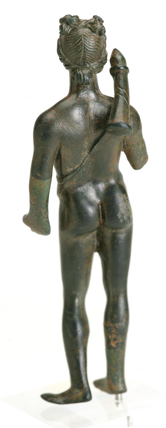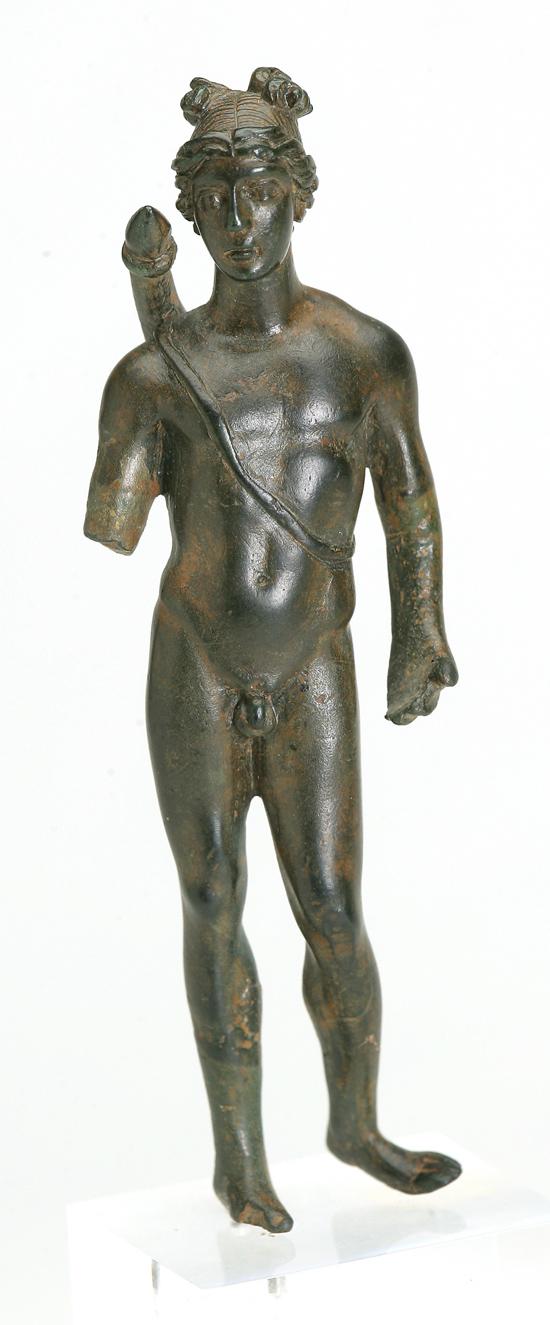 Roman Bronze Figure of Apollo. Circa 2nd Century A.D. Bronze solid cast. Apollo with empty quiver hanging downwards. Two knots of hair on his head with shoulder length hair knoted at nape of neck. Fine glossy brown patina. We note an ancient restoration, by over-casting, to the right foot and lower left arm, still quite elegant. Height 4". On a custom Lucite block.