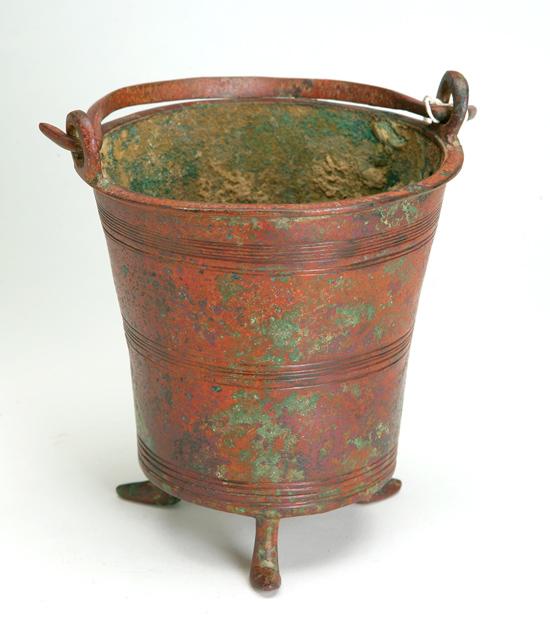 Roman Bronze Situla. Circa 2nd-3rd Century A.D. Of tapering cylindrical form set on three delicate shoe-shaped feet, with out-turned rim, two loops on the rim take the arched handle, the terminals hooked through the loops, the body decorated with three bands of incised lines. Height including loops 6½" Choice condiiton.