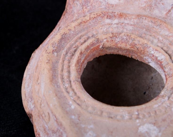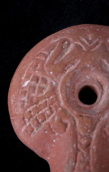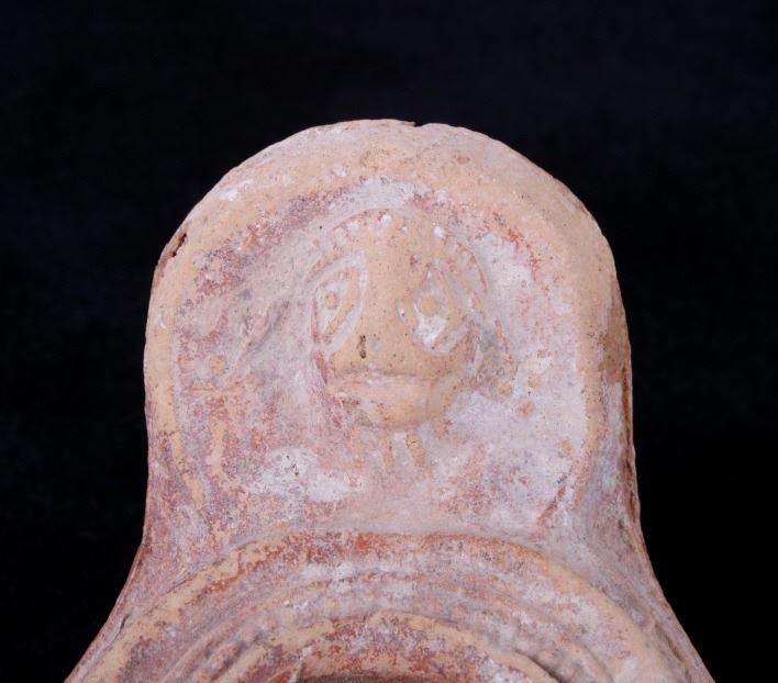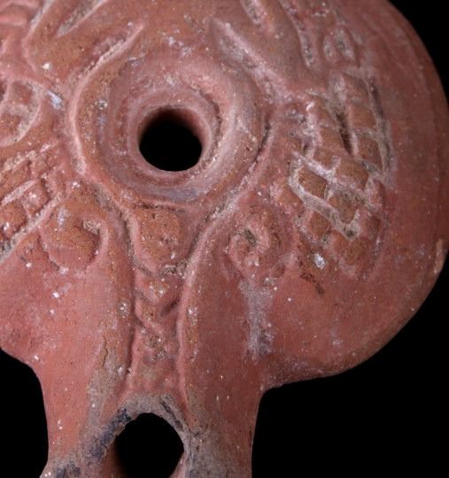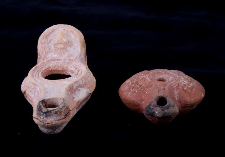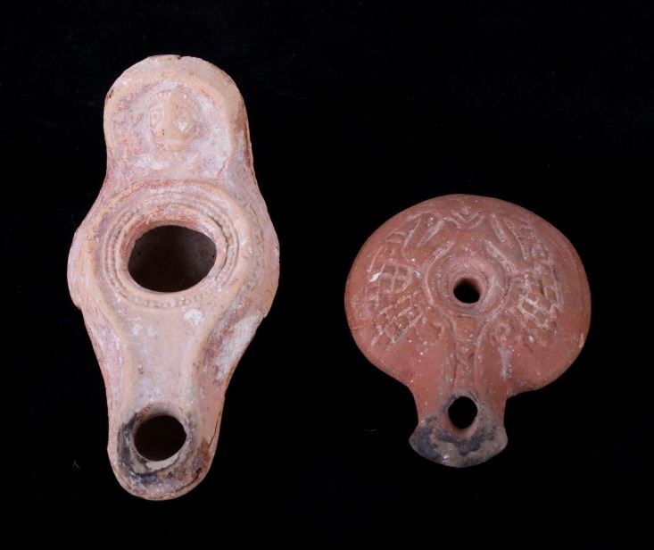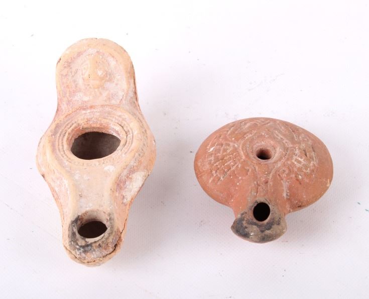 Featured in this lot is a pair of clay oil lamps from the Roman/Byzantine period, c. 4th-6th Century A.D. Both of these ancient clay lamps include a spout and fill hole, as well as tooling design that is clearly visible. They each show an orange clay color with some white chalkiness from age. The first lamp measures 4" x 2" x 2". The second measures 3" x 2.25" x 1". The lamps are in good condition for age.