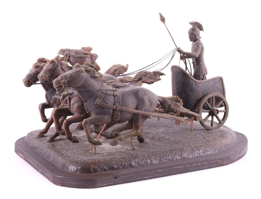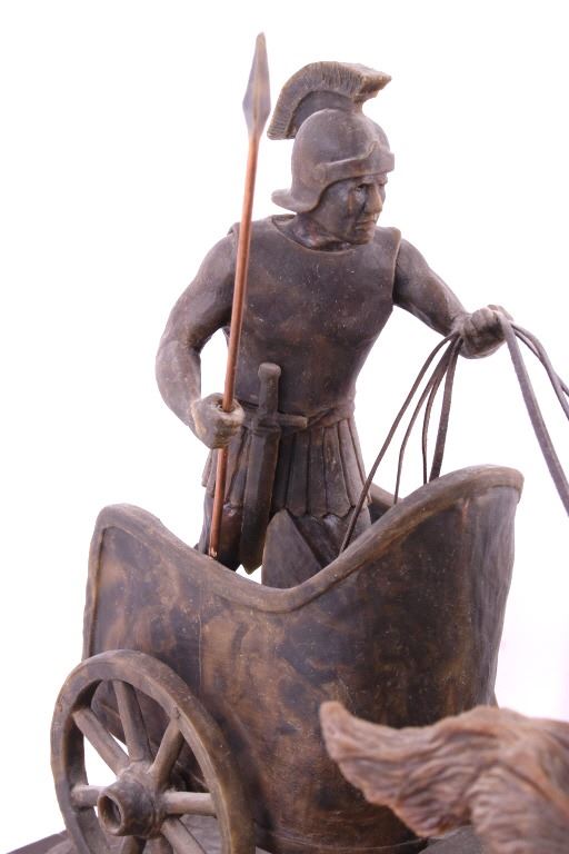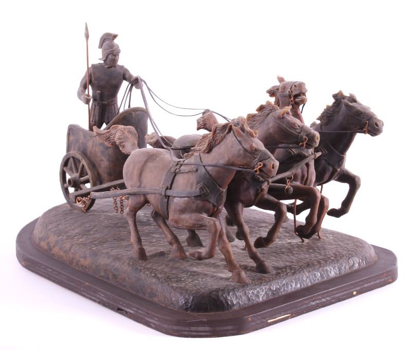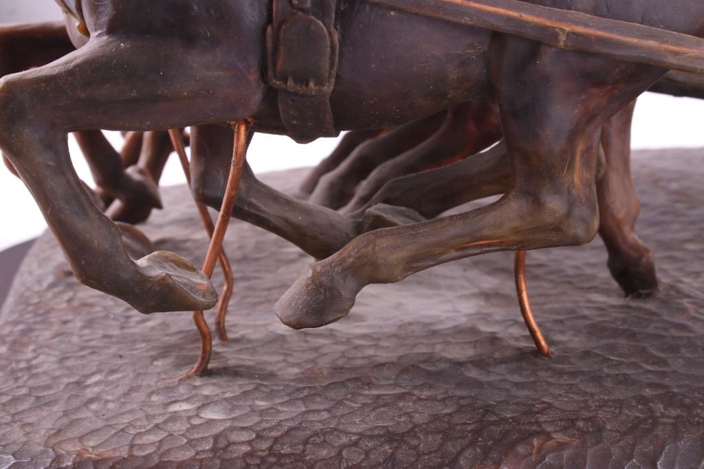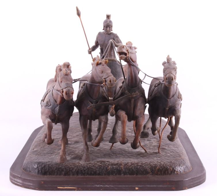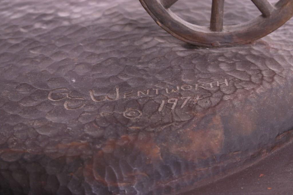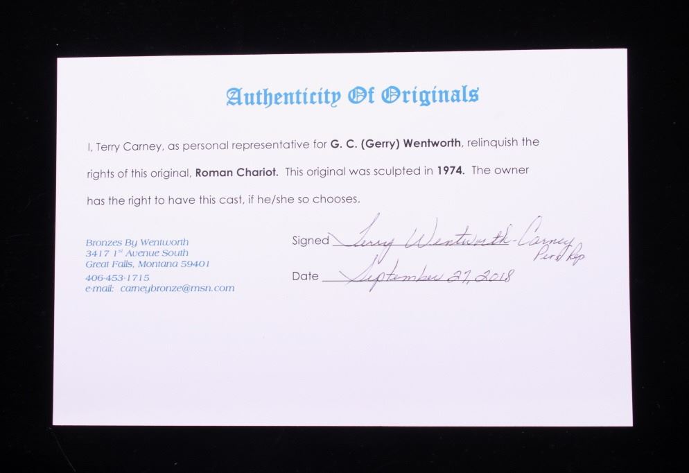 This is an original G.C. (Gerry) Wentworth wax sculpture titled "Roman Chariot". Gerry Wentworth was a Great Falls, Montana artist who grew up in the era just after Charles Russell's life. He was largely self taught and spent the majority of his life working in painting, sculpture and wood carving. Wentworth's works have been widely exhibited in such places as the C.M. Russell Show, the Phippen Art Show and the Frank Tenney Johnson Show. This sculpture shows a Roman warrior driving a quadriga. Quadrigas were emblems of triumph, in classical mythology, the quadriga is the chariot of the gods; Apollo was depicted driving his quadriga across the heavens, delivering daylight and dispersing the night. The figures are beautifully carved and show wonderful detail. The sculpture is in good condition. It has been signed by the artist G.C. Wentworth and is dated "1974". The wax sculpture is in good condition. It measures 20" x 14.25" and is 11.75" tall. Comes with a Certificate of Authenticity and relinquishes to the new owner the rights to have it cast. The artwork was appraised at $3000.
