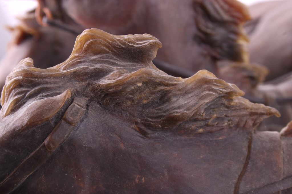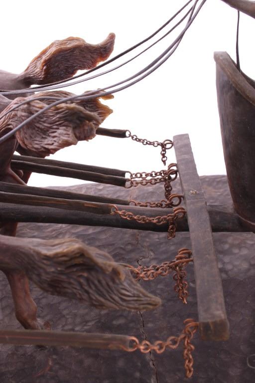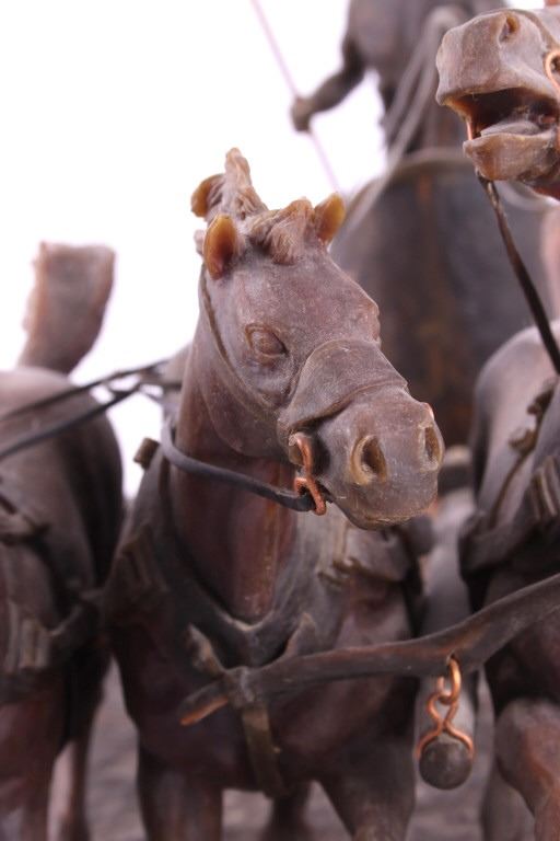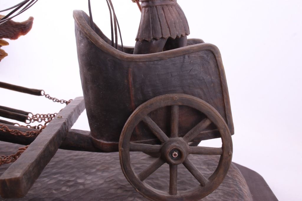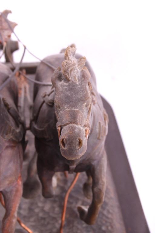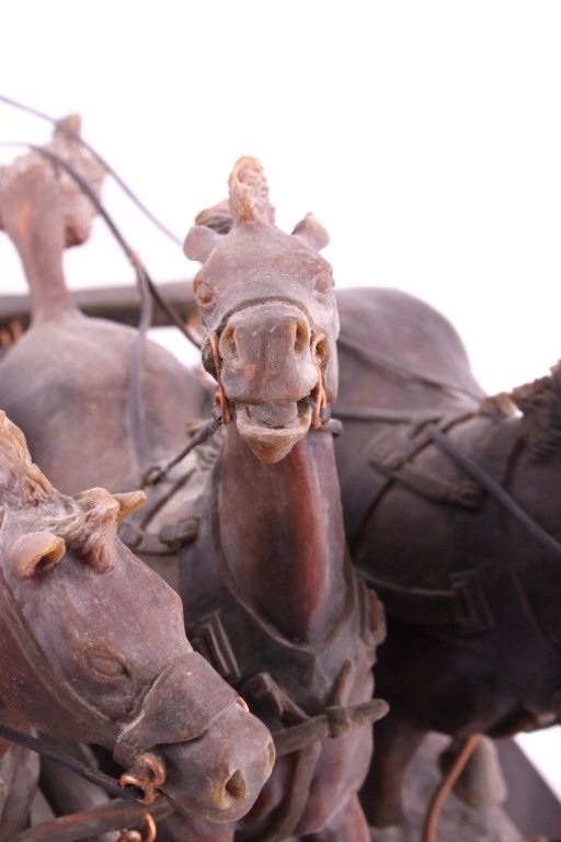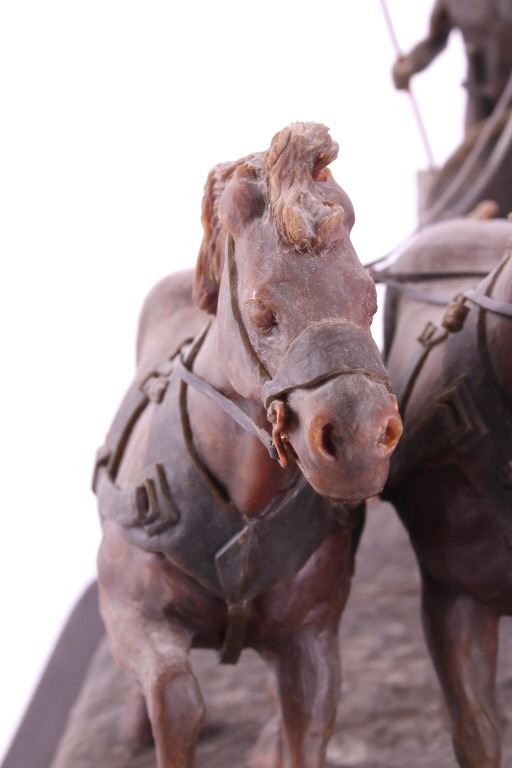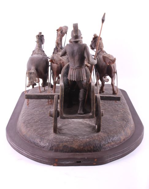 This is an original G.C. (Gerry) Wentworth wax sculpture titled "Roman Chariot". Gerry Wentworth was a Great Falls, Montana artist who grew up in the era just after Charles Russell's life. He was largely self taught and spent the majority of his life working in painting, sculpture and wood carving. Wentworth's works have been widely exhibited in such places as the C.M. Russell Show, the Phippen Art Show and the Frank Tenney Johnson Show. This sculpture shows a Roman warrior driving a quadriga. Quadrigas were emblems of triumph, in classical mythology, the quadriga is the chariot of the gods; Apollo was depicted driving his quadriga across the heavens, delivering daylight and dispersing the night. The figures are beautifully carved and show wonderful detail. The sculpture is in good condition. It has been signed by the artist G.C. Wentworth and is dated "1974". The wax sculpture is in good condition. It measures 20" x 14.25" and is 11.75" tall. Comes with a Certificate of Authenticity and relinquishes to the new owner the rights to have it cast. The artwork was appraised at $3000.