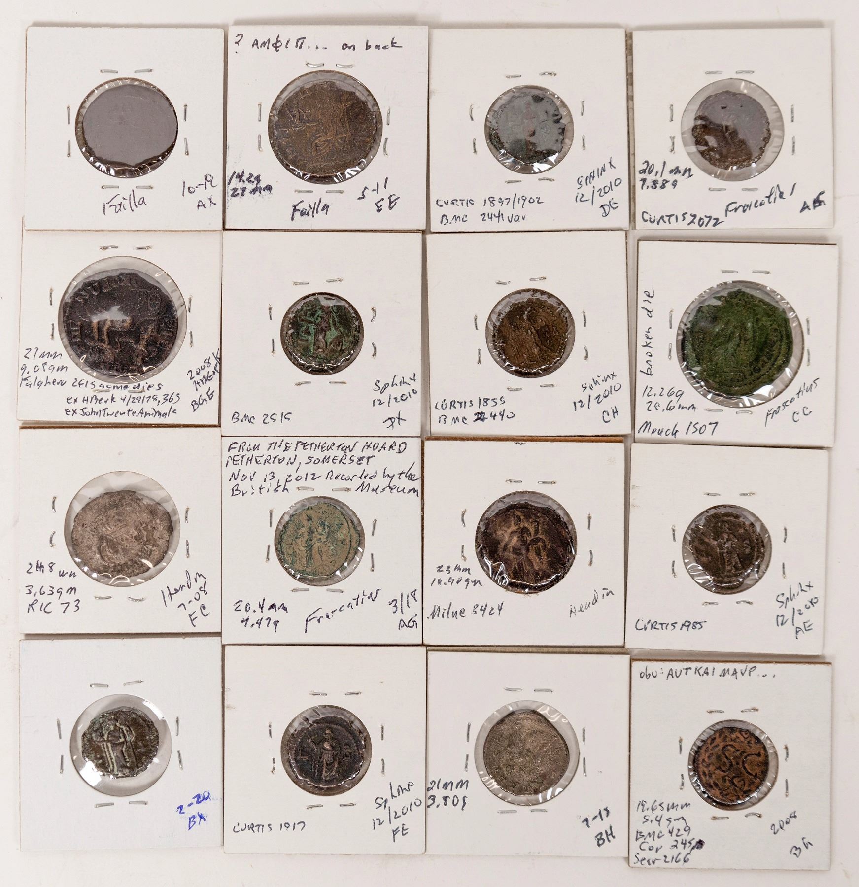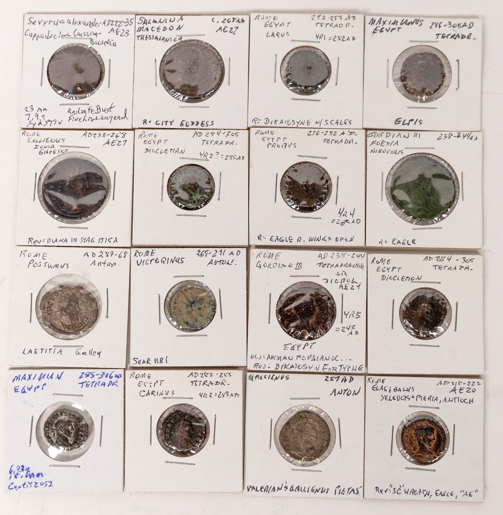 Sixteen different Roman coins. 13 provincials and antoniniari (double denari) of Gallienus, Victorinus and Postumus with galley. 8 Egyptian AE tetradrachms all different, 2 Diocletians. Beautiful Gallienus with biga of stags.
