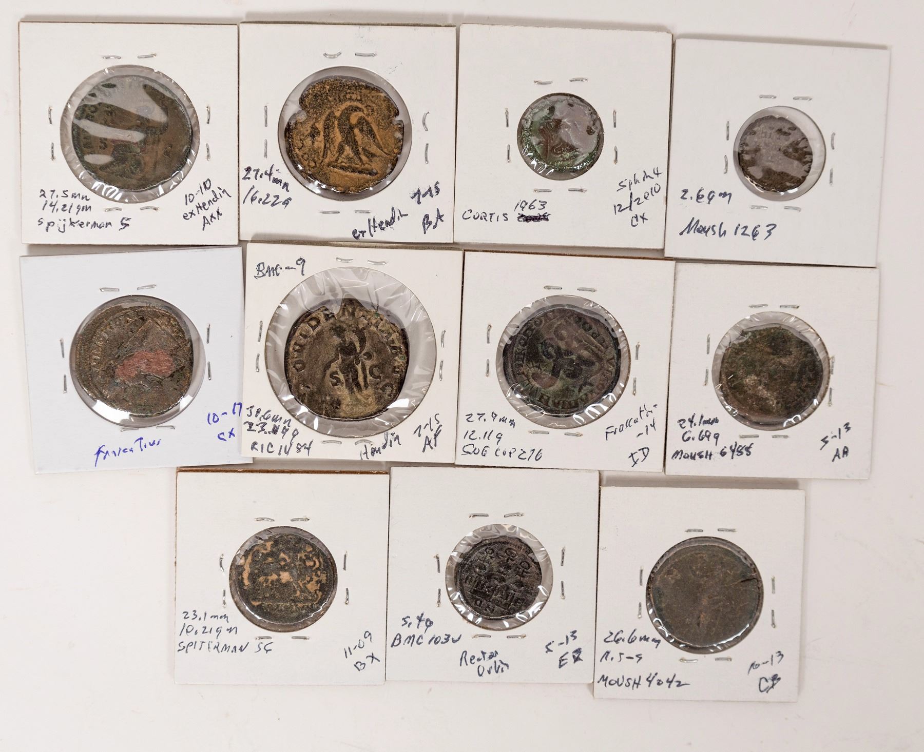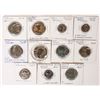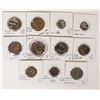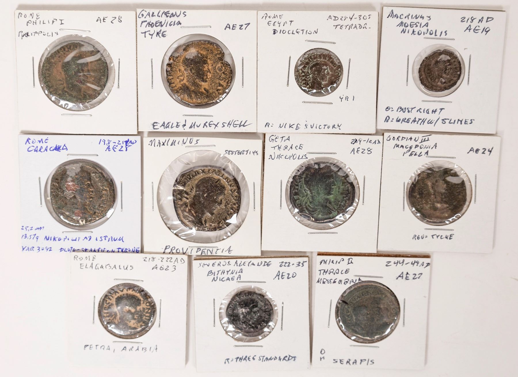 Eleven Roman coins: 10 provincials and a Maximinus sestertius. Coins of Tyre, Moesia, Petra, Nicaea, Pella. Talking snake god of Nicopolis and Egypt. Depicting: Pluto, Nike, Tyche, roman standards, Serapis, Athena enthroned, eagle and Providence.