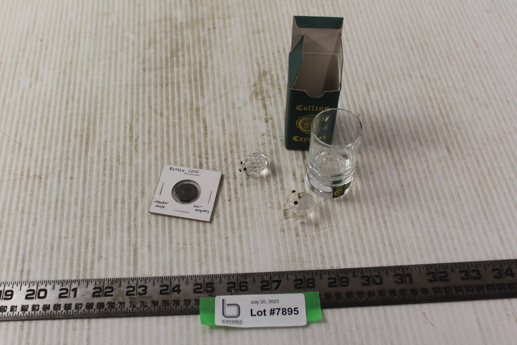Roman Coin (Irregular Shape, Non-Magnetic), Collins Crystal Shot glass, Tiny Glass Animals